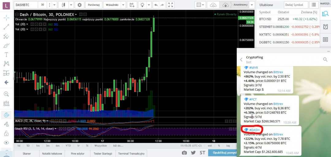 Witajcie. Od jakiegoś czasu gram na giełdach kryptowalut i odnalazłem niedawno fajnego bota, którego przetestowałem i pomnożyłem dzięki niemu zyski. Na pewno wam się przyda. Bot w skrócie wyświetla duże skoki i spadki poszczególnych kryptowalut. Przykład Na razie obsługuje 4 giełdy Poloniex Bittrex Cryptopia Yobit Bot w tym momencie jest zupełnie darmowy. Jak połączyć swoje konto CryptoPing z Telegramem 1. Na początku zainstaluj Telegram 2. Załóż konto na stronie CryptoPing ( patrz link poniżej) 3. Zaloguj się na konto CryptoPing i przejż do strony profilu. W instrukcji, jak połączyć się z Telegramem, znajdź linię dodaj bot do swojego Telegramu ... z linkiem. Kliknij link o nazwie @CryptoPingBot 4.Twój telegram powinien zostać otwarty i powinieneś zobaczyć kontakt z botem. Teraz możesz uruchomić bot, klikamy start. 5.Wróć do strony profilu i sprawdź, czy Telegram jest podłączony. Jeśli tak, to wszystko jest już gotowe i od tej pory będziesz otrzymywał sygnały. 6.Jeśli chcesz dodać nową kryptowalutę i obserwować duży wzrost lub spadek, klikasz w opcję + New Price Alert wpisujesz w okno wiadomości np dgb i ustawiasz wzrost ceny lub spadek. W tym momencie trwa ICO ( Initial Coin Offering nazywane czasami też IPCO – Initial Public Coin Offering jest to działanie startupów mające na celu zebranie kapitału poprzez dystrybucję części środków ludziom, którzy zdecydowali się ją wesprzeć. Strona CryptoPing: https://cryptoping.tech (czysty) Przedsprzedaż tokenów. Gdyby ktoś rejestrował się na stronie lub inwestował w ten projekt i kupował tokeny tu jest mój link ref http://bit.ly/2rGSdJc White Paper: https://cryptoping.tech/cp_whitepaper_en.pdf Roadmap: https://cryptoping.tech/roadmap Wysokich zarobków