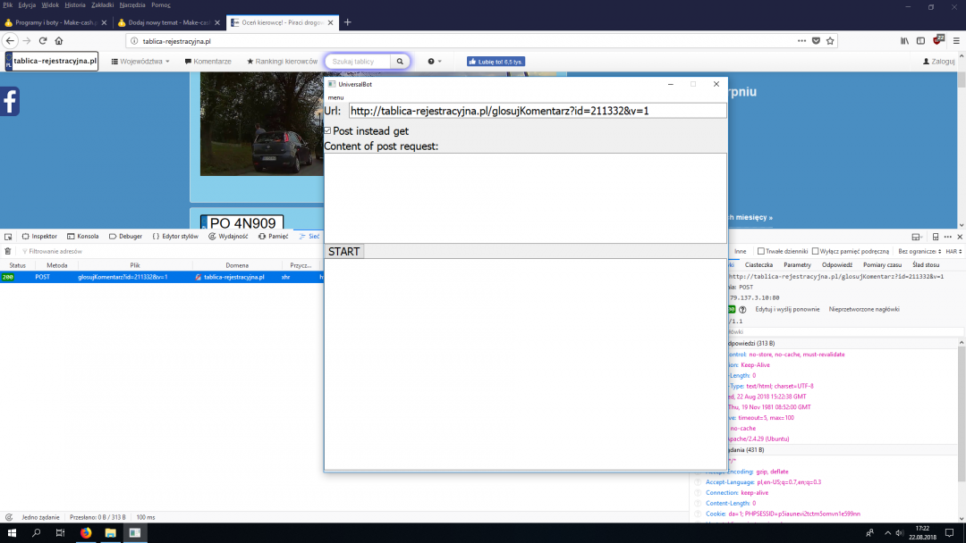 Witam, przedstawiam Wam program, który powtarza jedno zapytanie GET lub POST z wielu serwerów proxy typu HTTP. Można użyć tego programu do np. nabijania ocen obrazkom, artykułom, komentarzom, itp. na stronach, gdzie wymagane jest wysłanie tylko jedno zapytania bez wcześniejszego zalogowania. Zasada użycia jest prosta. Po załadowaniu strony, odpalamy konsolę w przeglądarce, klikamy np. łapkę w górę tam, gdzie chcemy dać ocenę. Potem zawartość zapytania wklejamy do programu i kilkamy START. Przedtem do w pliku proxies.txt umieszczamy dane naszych serwerów proxy w formacie: ip:port lub ip:port:użytkownik:hasło. Każdy serwer proxy umieszczony jest w osobnej linijce. Program przetestowałem na stronach takich jak http://tablica-rejestracyjna.pl/ czy https://chamsko.pl/, gdzie do wystawienia oceny wystarczy zrobić jedno zapytanie bez konieczności logowania się. W razie wątpliwości dotyczących działania programu, pytajcie śmiało Kod źródłowy: https://github.com/arkadiusz97/UniversalBot Skompilowany program gotowy do uruchomienia pod systemami Windows 7/8/10: https://github.com/arkadiusz97/UniversalBot/releases/download/1.1/bin_UniversalBot.zip -