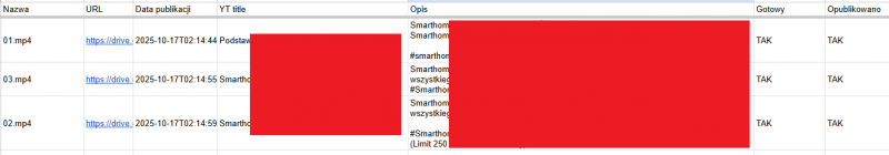 Cześć, przychodzę z kolejnym updatem. Ten tydzień to był głównie tydzień dopracowywania formularza zapisu do newslettera (poniedziałek-środa: logika, wygląd, treść) oraz kanałów social media jako "naganiaczy" do zapisów na newsletter (czwartek-piątek: TikTok, Instagram, YouTube - tylko materiały video). Wczoraj ukończyłem wersję MVP mojego planera w tych Social Mediach. Materiały do sociali generuje w Invideo AI (https://invideo.io/). Co do tego serwisu powiem szczerze, że mam mieszane uczucia. Dlaczeo? - Zalety: na darmowym planie generuje całkiem spoko filmiki na podstawie prompta. Filmiki generuję 10-15 sekundowe - Wady: zupełnie nie ogarniam ich darmowego planu - niby piszą że na darmowym planie mogę wygenerować 10 minut filmów tygodniowo (https://help.invideo.io/en/articles/9380226-can-i-use-invideo-ai-for-free) natomiast po wygenerowaniu filmu i chęci wygenerowania kolejnego, dostaję komunikat że skończyły mi się kredyty i muszę zakupić wersję premium. Chore. Albo ja coś robię źle (czego też nie wykluczam). Na szczęście jak kiedyś bawiłem się w Ero, mam do dyspozycji 6549432138813 kont na gmailu, więc będę się logować z każdego konta osobno w celu generowania nowego video Co do planera postów w socialach - działa całkiem spoko. Zrobiłem go za pomocą make.com (google drive + google sheets + buffer + Gemini) oraz Zapier, jednak wciąż jest tam trochę chaosu. Zdecydowałem jednak że czas na poprawki będzie później. Zasada działania w planerze jest następująca (w tej kolejności): - w danym katalogu na Google drive jest pobierana lista wszystkich plików video - generowane są linki publiczne do tych plików - linki zapisywane są do zmiennej w konfiguracji pozwalającej na pobranie plików - sprawdzane jest czy dany plik znajduje się już na liście w planerze - jeżeli nie, wówczas: - Gemini za pomoca wbudowanego prompta wybiera mi treść do posta w Social Mediach - Gemini, na podstawie wyżej wygenerowanego opisu, buduje mi tytuł pod filmik na YouTube - całość jest wpisywana do planera w Google Sheets Wygląd logiki w make.com dla tego planera: Wygląd planera: Następnie "odpala" się Zapier, który odpala się wtedy, gdy w Google Sheets znajduje się nowy wiersz. Wówczas dane z tego wiersza ładuje do Buffera (odpowiedzialny za planowanie postów w Socialach) i tam wrzuca posty do kolejki. Jako datę publikacji wybrałem od momentu pojawienia się pliku + 1 dzień. Niestety z datą jest pewien "rozpierdziel" gdyż jeżeli załóżmy wrzuciłem dziś filmik o godzinie 10:00 to potrafi mi go zaplanować kolejnego dnia o godzinie 04:00. Próbowałem dopisywać korekty strefy czasowej, manewrować godzinami ale nic to nie dało. Ale doszedłem do wniosku że teraz to jest mało ważne, kosmetyką zajmę się kiedy indziej. Także tak na razie wygląda mój planer postów. Fajne w nim jest to, że po prostu wrzucam filmik do katalogu na Google Drive i "nic więcej mnie nie interesuje, reszta dzieje się sama" ale jednak widzę też że będę musiał jeszcze przed publikacją postów dodać mechanizm weryfikacji zanim post "pójdzie w świat" bo Gemini lubi dorzucać coś od siebie i jest to "niebezpieczne" gdy wpadnie jakaś głupota i zostanie ona opublikowana. Moje spostrzeżenia odnośnie tych 3-ech social mediów (TikTok, Instagram, YouTube): 1. TikTok: - "szalona" liczba wyświetleń. Nie wiem jak działa ich algorytm, ale jak na posty które znalazły się dosłownie kilka godzin temu a konto jest stosunkowo nowe, ilość wyświetleń to 91/256/376 (3 filmiki) oraz 1 polubienie. - nie wiem jak to w przyszłości będzie się miało do konwersji (przez konwersję rozumiem zapis na newsletter) 2. Instagram: - wyświetlenia: 0/0/2 3. YouTube: - jako że są to filmiki z rozdzielczością 16x8, są one wrzucane jako YouTube Shorts. Wyświetlenia: 58/12/177 w tym 1 subskrypcja i 1 lajk - co ciekawe, filmik z największą ilością wyświetleń to filmik który zebrał lajka i prawdopodobnie z niego wpadła subskrypcja, w mojej ocenie jest najbardziej "beznadziejnym" filmikiem spośród tych 3-ech. Nie mam pojęcia dlaczego właśnie z niego wpadł taki "wynik" Moje odczucia - Instagram jest beznadziejny. Szansę widzę w TikToku oraz YouTube odnośnie klipów video. Odpalę jeszcze dodatkowo Twitter i może coś jeszcze. Jako że w temacie YouTube oraz TikTok jestem "zielony jak trawa", mam pytanie do bardziej wdrożonych w te platformy użytkowników tego forum a konkretnie odnośnie YouTube: - czy shortsy wpływają na ilość wyświetleń w warunkach przyjęcia kanału do monetyzacji czy tylko wpływ mają na to tradycyjne filmiki (16:8)? Na tą chwilę to tyle. Pozostaje mi dokończyć jeszcze w systemie wysyłki newslettera wygląd e-maili z podziękowaniami za zapis oraz automatyzację z treściami artykułów do newslettera wychodzącego raz w tygodniu i można odpalać newsletter. Chciałbym aby to już chulało od najbliższego poniedziałku, tj. od 20.10.2025 ale zobaczymy jak to będzie. Pozdrawiam!