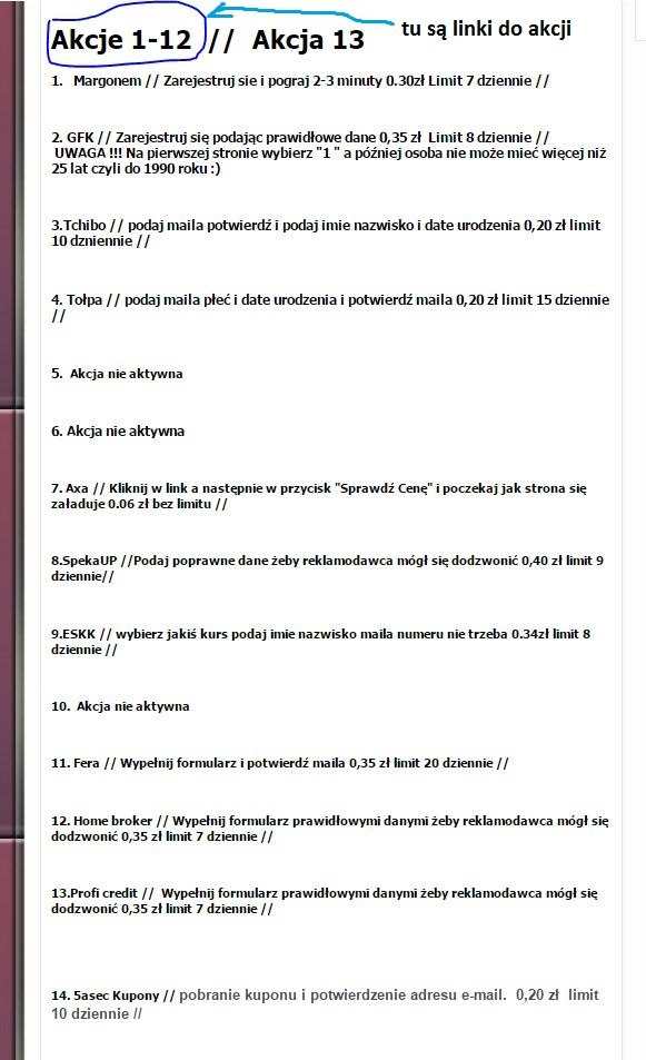 Witam. Chciałbym wam przedstawić zupełnie nowy serwis zarobkowy o nazwie slcash. Jest on świeży powstał całkiem niedawno i na pewno jeszcze o nim nie słyszeliście. Zarabianie na nim polega tak jak na mypay, kubigo itp na wykonywaniu różnych akcji np. rejestracja z potwierdzeniem, udział w ankietach itp. Jak widać akcji jest całkiem sporo, są duże limity i spore wynagrodzenia. Wygląd strony może nie jest najlepszy, ale gdy strona się rozwinie to się zmieni Wink wypłaty na paypal oraz konto bankowe. Na paypal i konto bankowe PKO wypłaty są realizowane od razu po zawiadomieniu administratora. Minimum do wypłaty to 12,05 zł. Wkrótce nagram filmik prezentujący stronę. Jeżeli chcecie się zarejestrować proszę pisać do mnie na gadu - 7771387 nie mój dowody wypłaty: strona główna - http://slcash.pl/ rejestracja - musisz zgłosić się do mnie Kilka złotych rad: 1. Pamiętaj, żeby potwierdzać w e-mailu kody aktywacyjne z tych stron. 2. Przy wypełnianiu danych nie trzeba podawać prawdziwych danych, aby akcja była zaliczona musisz podać jedynie poprawny email oraz numer telefonu (nie w stylu 666666999), najlepiej żeby był wiarygodny, np. 798555663 czy 785659896. 3. Jako imię/nazwisko itd. nie wpisuj fraz(słów) typu: „dasd”, „cnzkxcjnaso”. 4. Między wypełnianiem akcji trzeba wyczyścić ciasteczka w przeglądarce oraz zmienić IP np. robimy wszystkie dostępne akcje po czym czyścimy ciasteczka, zmieniamy IP i tak w kółko. 5. Najlepiej tworzyd emaile na poczcie o2.pl. Przy zakładaniu dostajemy aż 4 konta (login@o2.pl, login@tlen.pl, login@go2.pl i login@prokonto.pl). Plusem jest to że strony(akcje) widzą 4 różne emaile, a e wiadomości z nich idą na jedną skrzynkę. 6. Wszystkie akcje/konkursy są w 100% darmowe. Wszystko może wydawać się skomplikowane i na pierwszy rzut oka jest to dużo roboty, ale po pewnym czasie nabierze się wprawy.