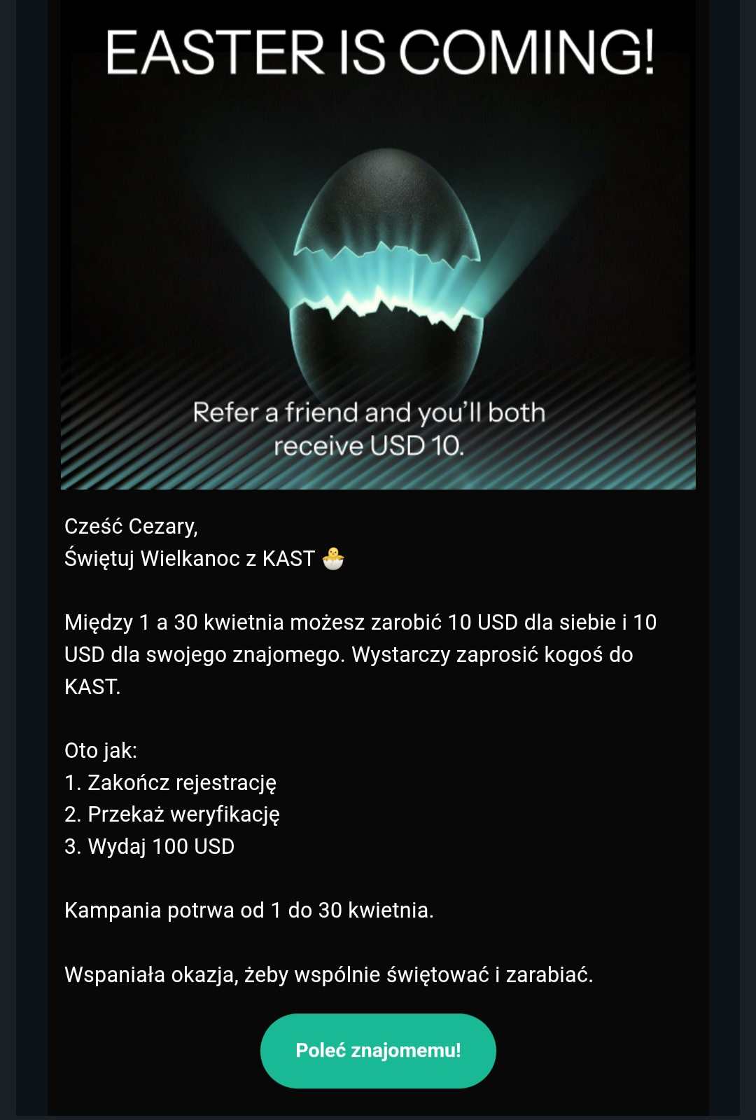 1. WIELKANOCNA PROMOCJA KAST ZARÓB RAZEM ZE ZNAJOMYM Tylko od 1 do 30 kwietnia Oboje otrzymujecie po 10 USD! Jak to działa? Zarejestruj się w KAST Z69NIRX8 Link: https://go.kast.xyz/VqVO/Z69NIRX8 Czysty: https://www.kast.xyz/ Przejdź weryfikację (KYC) Wydaj minimum 100 USD darmową kartą wirtualną Zaproś znajomego i zgarnijcie nagrodę razem! Idealna okazja, żeby świętować Wielkanoc i jednocześnie zarobić Poleć znajomemu już teraz!