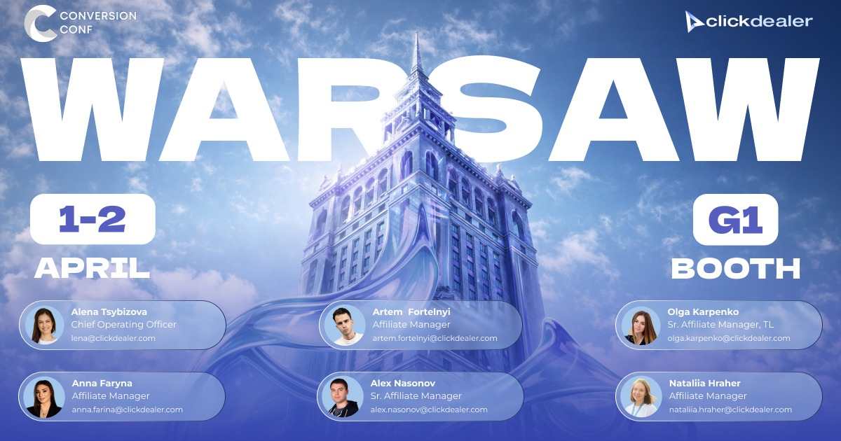 Odliczanie do Warszawy Zespół ClickDealer będzie na Conversion Conf 1-2 kwietnia. Znajdziesz nas na stoisku G1 - tam, gdzie dzieją się najważniejsze rozmowy. Niezależnie od tego, czy chcesz pogadać o współpracy, sprawdzić najnowsze oferty czy po prostu złapać się na kawę, chętnie się spotkamy. Chcesz mieć pewność, że znajdziemy czas tylko dla Ciebie? Zarezerwuj spotkanie przed eventem i przejdźmy od razu do konkretów. Do zobaczenia! -