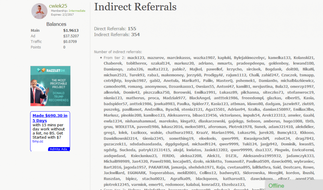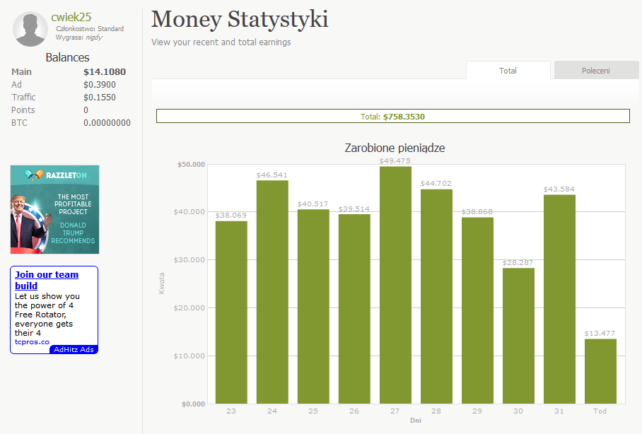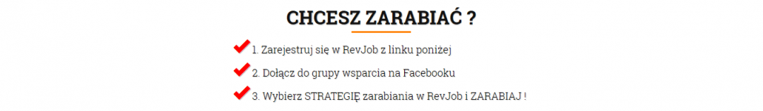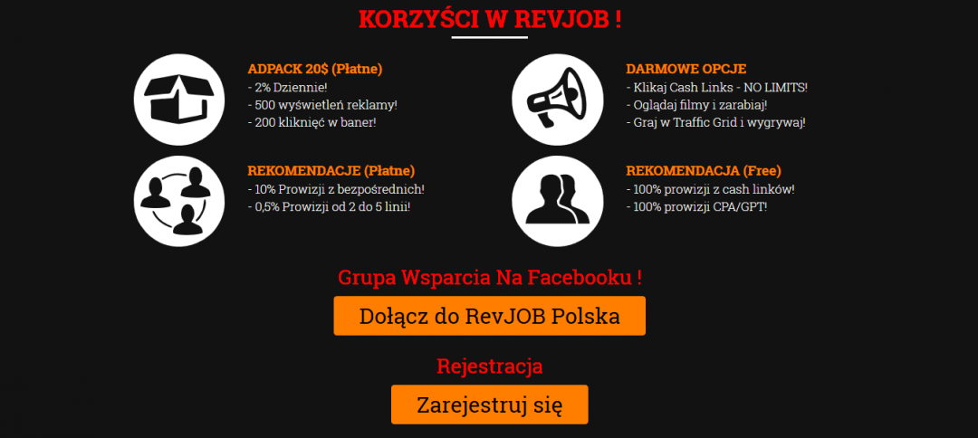 Witam wszystkich! Przyszła pora na pierwszy program z dziedziny RevShare w który wszedłem, czyli jak zarobiłem 500$ w 15 dni Zdecydowałem się dodać RevJob do swojego portfolio, z jednego prostego powodu... można na nim dużo zarobić niskim kosztem oraz małym nakładem pracy! Czym jest RevJob? Jest to firma dzieląca się ze swoimi użytkownikami przychodami z reklam i/lub innych źródeł. Daje nam możliwość zarobienia i to nie małych pieniędzy oraz możliwość żeby brać udział w podziale zysków należy w takim systemie wykupić usługę reklamową (np. reklamę własnej strony internetowej), opłacić ją, wykorzystać – tu trzeba raz na 24 godziny obejrzeć 10 reklam. Obejrzysz – to masz możliwość zarobienia 25% czyli 5$ od każdego wykupionego za 20$ Adpacka (usługi reklamowej) . Można także zarabiać razem z firmą bez wykupowania Adpacków, firma daje nam możliwości: klikanie w cash linki, oglądanie video, traffic X, traffic Grid, Like na Facebook, zadania CPA/GPT, Jackpots. Czy ja się do tego nadaję? Odpowiedź brzmi TAK , a dlaczego? Ponieważ posiadasz czas, aby zaangażować 5 min dziennie na obejrzenie 10 reklam, program dopiero niedawno ruszył, więc potencjał projektu i możliwości są ogromne. Małe podsumowanie programu: Po 15 dniach ponad 260 poleconych Zyski na poziomie dziennym ok 20-30 $ DLA KAŻDEGO PARTNERA STRONA DO PROMOCJI BIZNESU GRATIS W DWÓCH JĘZYKACH !! POLSKA WERSJA ANGIELSKA WERSJA PODSUMOWANIE MIESIĄCA GRUDZIEŃ 2016 Z FIRMĄ REVJOB !!! ŁĄCZNIE ZAROBIONE PONAD 3000 ZŁ PRAWIE 400 OSÓB W TEAMIE !!! CZY KTOŚ MA JESZCZE WĄTPLIWOŚCI ŻE NIE JEST TO PETARDA !