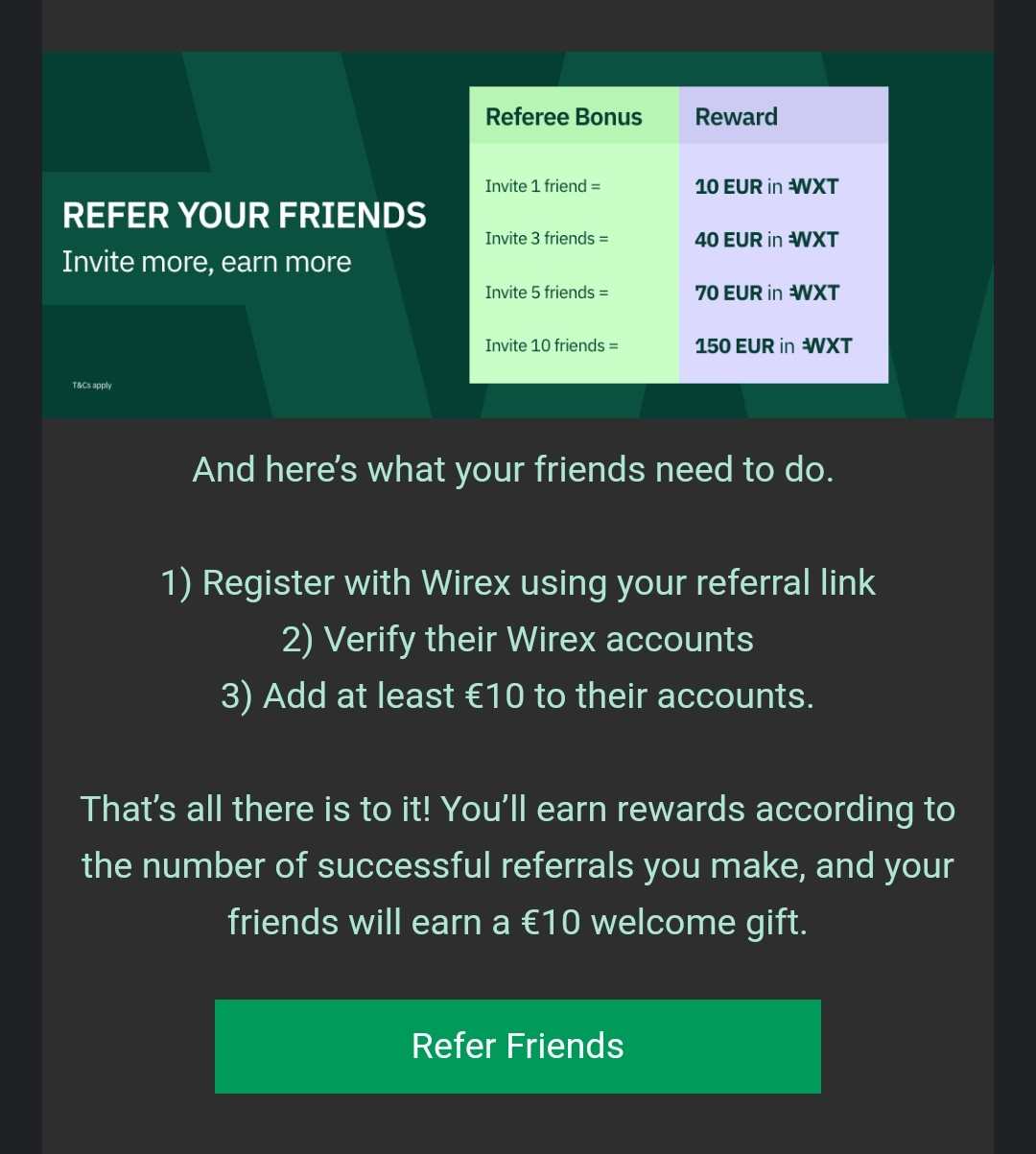 1. Witam serdecznie! Ponownie Wirex wyskoczył z nową promocją, obecnie do zdobycia 10€ w walucie WXT za rejestrację, zweryfikowanie tożsamości oraz wykonanie depozytu kartą na przynajmniej 10€ (dla bezpieczeństwa lepiej wpłacić kilka euro więcej). Czysty: https://wirexapp.com/ Regulamin: https://community.wirexapp.com/t/refer-friends-earn-up-to-eur-150-in-wxt/23860 Bonus przychodzi na konto do 30 dni, poniżej zrzut z wypłatą za poprzednią akcję W razie pytań chętnie pomogę!