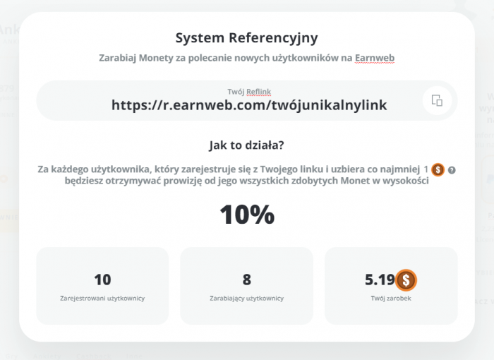 Cześć, drodzy użytkownicy forum Make-Cash!👋 Mamy dla was ekscytującą aktualizację dotyczącą Earnweb.com – platformy, którą już dobrze znacie.😉 Tym razem chcemy przedstawić wam szczegóły dotyczące naszego nowego systemu referencyjnego, który pozwoli Wam jeszcze szybciej zwiększać swoje zarobki online. Proces jest prosty: udostępniasz swój unikalny link polecający, a gdy nowy użytkownik zarejestruje się przez ten link, będziesz mógł cieszyć się prowizją w wysokości 10% z jego zarobków!💰 Aby otrzymać prowizję, polecony użytkownik musi zarobić minimum 1 monetę wraz z punktami doświadczenia. Prowizję zaczniesz otrzymywać w momencie, gdy użytkownik spełni powyższy warunek, a naliczona prowizja uwzględni sumę wszystkich monet, jakie zostały dotychczas zarobione przez poleconego użytkownika. >> SYSTEM REFERENCYJNY << Zachęcamy was do polecania Earnweb swoim znajomym i cieszenia się wspólnymi korzyściami! Więcej na temat naszego systemu referencyjnego oraz najczęściej zadawane pytania możecie znaleźć tutaj. W razie jakichkolwiek pytań, śmiało pytajcie. Do zobaczenia na Earnweb.com! Pozdrawiamy, Zespół Earnweb- 12 odpowiedzi