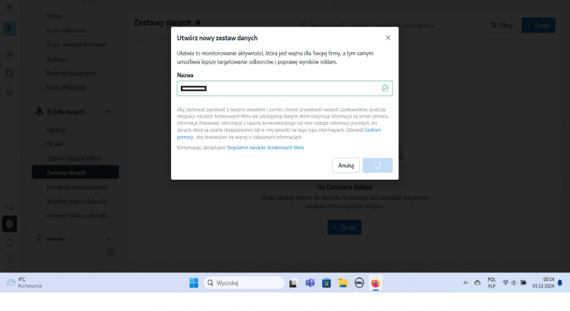 Witam, Próbuje stworzyć zestaw danych. Jestem w ustawieniach firmowych przy zakładce "źródło danych" klikam "zestaw danych". Klikam przycisk dodaj a następnie wybieram nazwę po czym klikam "utwórz". Niestety zestaw danych nie chce się stworzyć obraca się to kółko w niebieskim prostokącie. Czy jest ktoś z Was powiedzieć gdzie leży problem lub wskazać jak mogę ten problem rozwiązać ?
