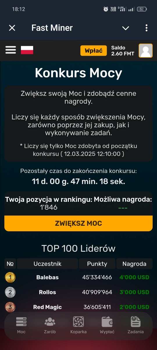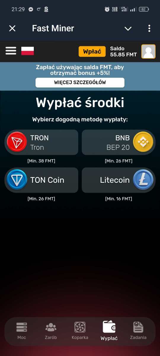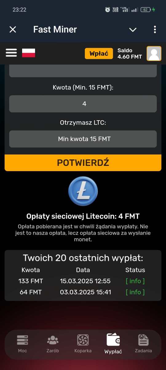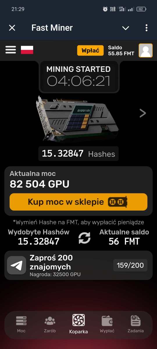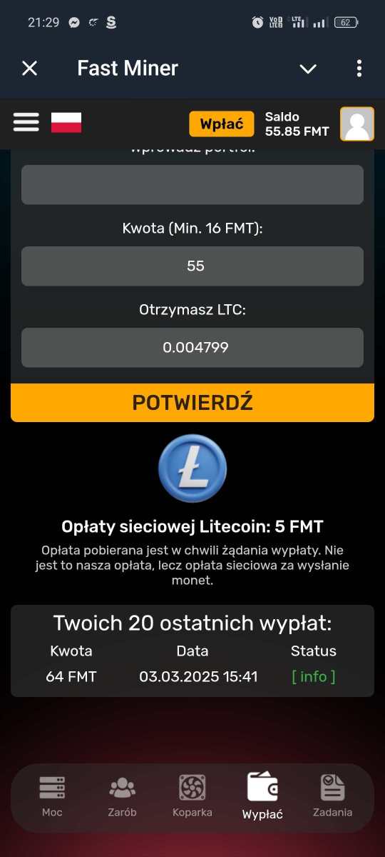 Witam prezentuje projekt Fast Miner na Telegramie Link czysty https://t.me/MineFast_bot?start Link polecajacy https://t.me/MineFast_bot?start=448963 korzystajac z linku polecajcego otrzymujecie moc wydobywcza na start !! Dajecie Start Mining i zaczynacie Kopać punkty FMT które można odrazu wypłacać na wallet obsługujący dana Kryptowalute Poniżej SS z TG i dowód wypłaty Ja wpłacilem jakieś 10$ w LTC żeby to ruszyło i dziennie te pare $ wpada .