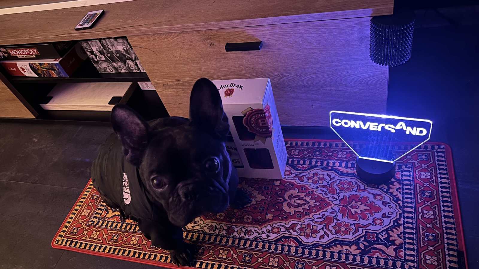 Nie tylko leadami człowiek żyje. Dywan idealny dla mojego Frenchie. Ona często ćwiczy psią jogę więc jej się przyda. Whiskacz już pusty, więc proszę o dostawę. Lampka LED pięknie uzupełnia moje tło za biurkiem więc 10 na 10.