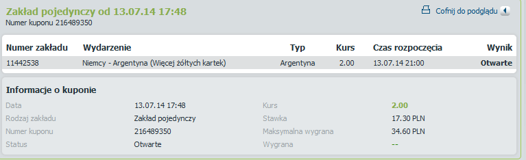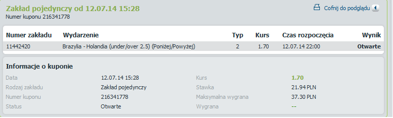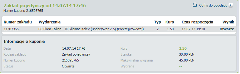 Trzeci typ: Statystyki: Kapitał: 50,00,zł Skuteczność: 2/0 Skuteczność procentowa: 100% Zysk: 27.94 zł