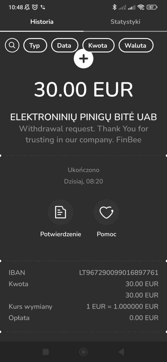 Jak otrzymać 10€ 1. Zarejestruj się z linku -> http://finbee.lt/en/I-44145731 , czysty link, z którego nie ma bonusa -> http://finbee.lt 2. Zweryfikuj konto (KYC) - 5€ otrzymasz po weryfikacji 3. Wykonaj depozyt na kwotę 5€ i zainwestuj całość 10€ w pożyczkę na primary market 4. Po zainwestowaniu łącznie 10€ od razu dostaniesz kolejne 5€ 6. Bonus musi zostać zainwestowany, zanim będzie możliwe jego wypłacenie, więc zainwestuj 5€, które dostaniesz w dowolną pożyczkę na primary market 7. Sprzedaj pierwszą pożyczkę na secondary market i wypłać (ok. 10€) 8. Drugą za 5€ możesz wypłacić po zakończeniu czasu tej pożyczki Informacje dodatkowe: 1. Weryfikacja trwa do 24h