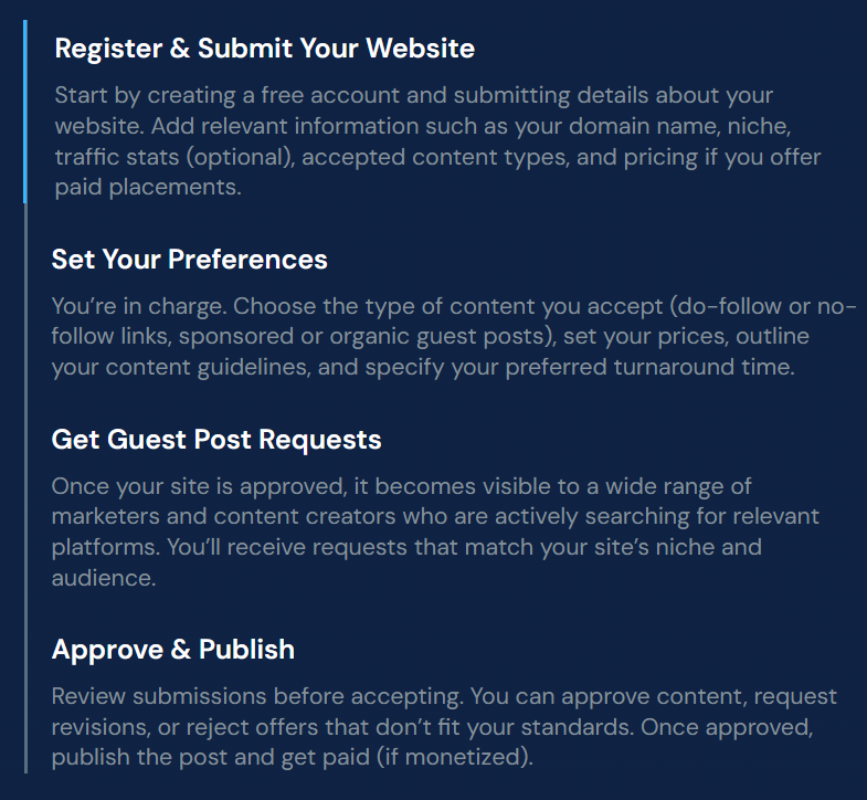 Po zatwierdzeniu strony przez system, serwis staje się widoczny dla reklamodawców. Od tego momentu można otrzymywać zlecenia publikacji artykułów sponsorowanych. W zależności od ustawień, wydawca może samodzielnie akceptować treści lub korzystać z trybu automatycznego, w którym zamówienia realizowane są bez dodatkowej ingerencji.