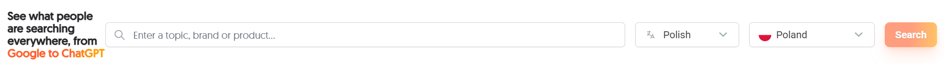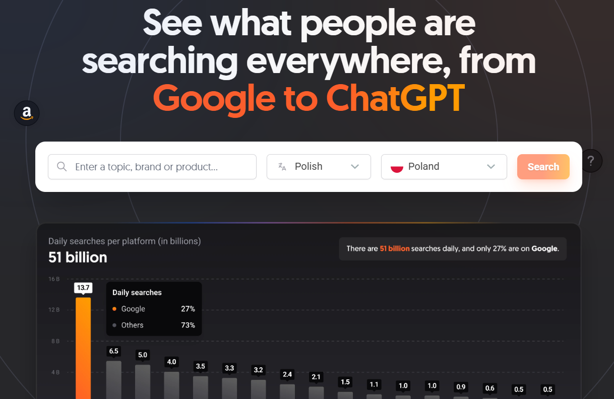 Platforma działa analogicznie do Google Trends, przy czym pokazuje także dane z Chat GPT i platform społecznościowych.