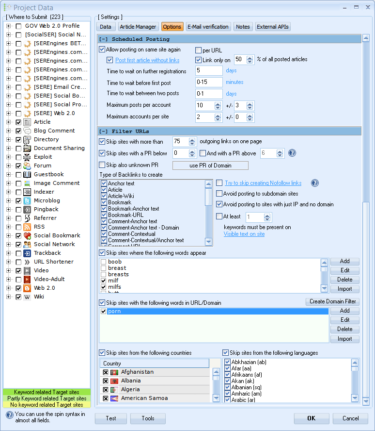 - Opcja filtrowania - GSA może filtrować linki tak, byś mógł otrzymywać backlinki z tych stron, które Ci pasują. Filtry zawierają m.in. opcje języka, kraju, ilości linków wychodzących (OBL), filtr spamu, dofollow/nofollow.
