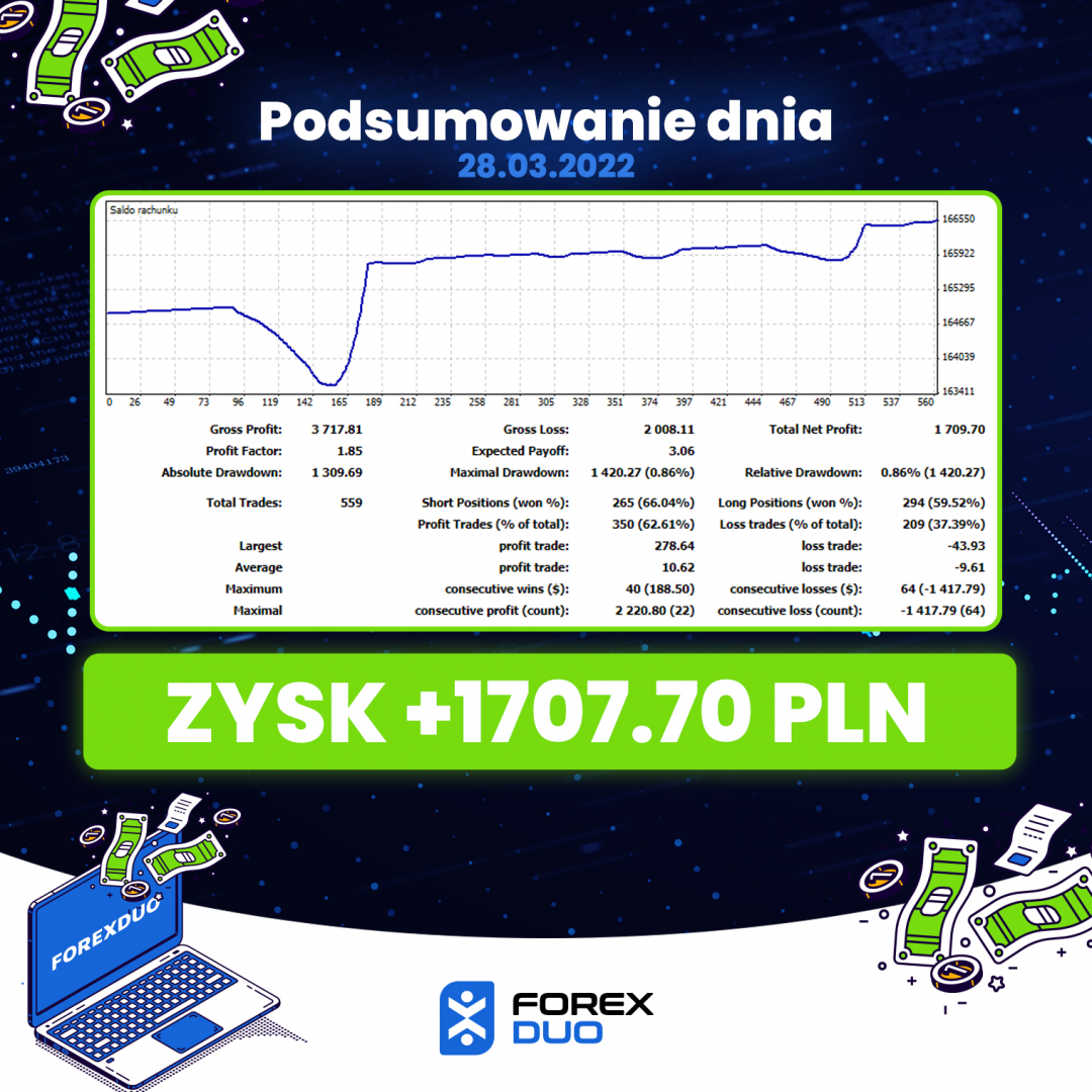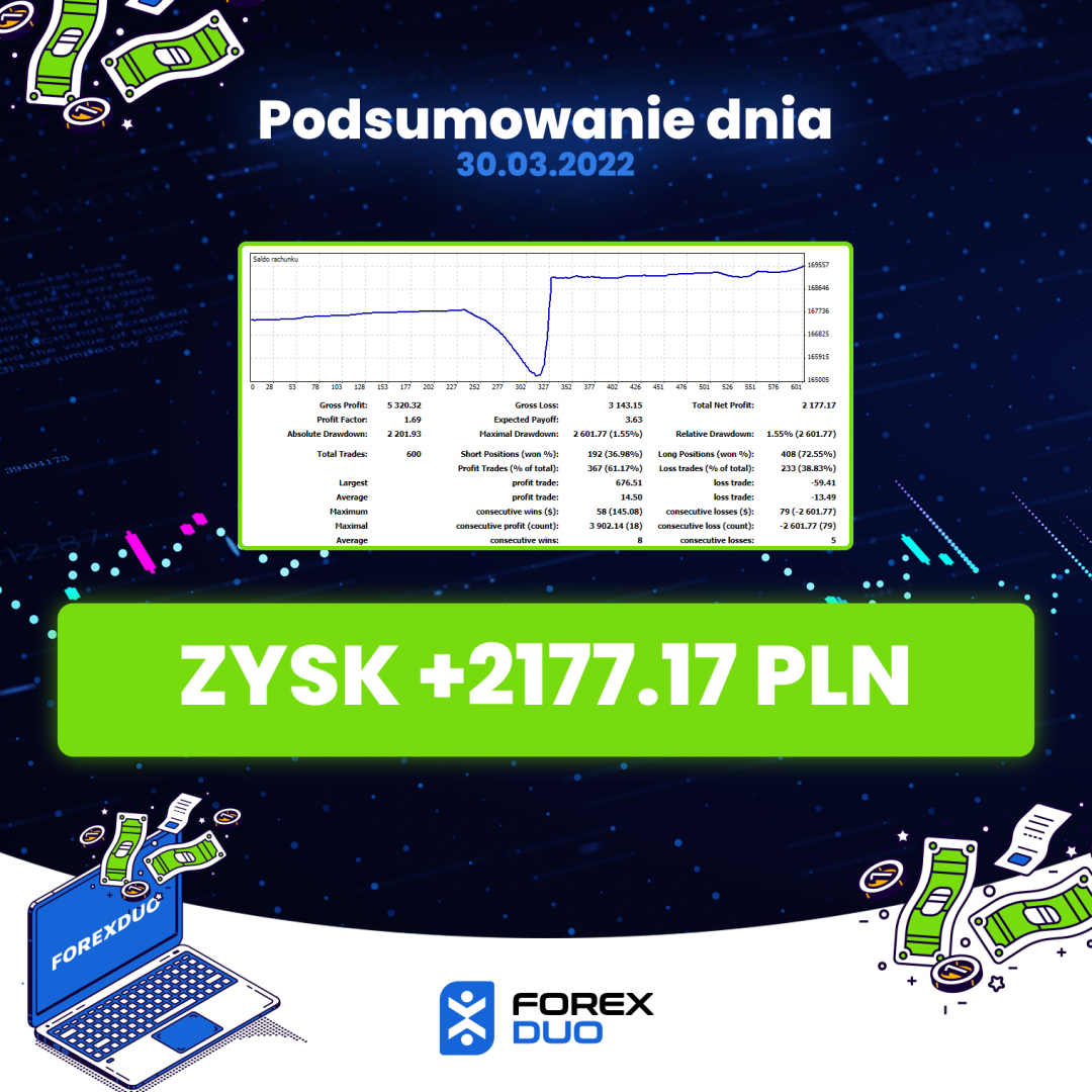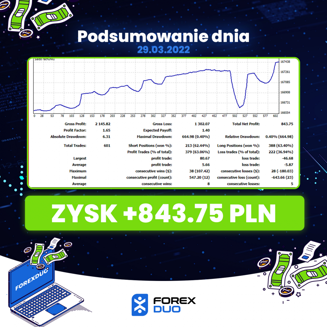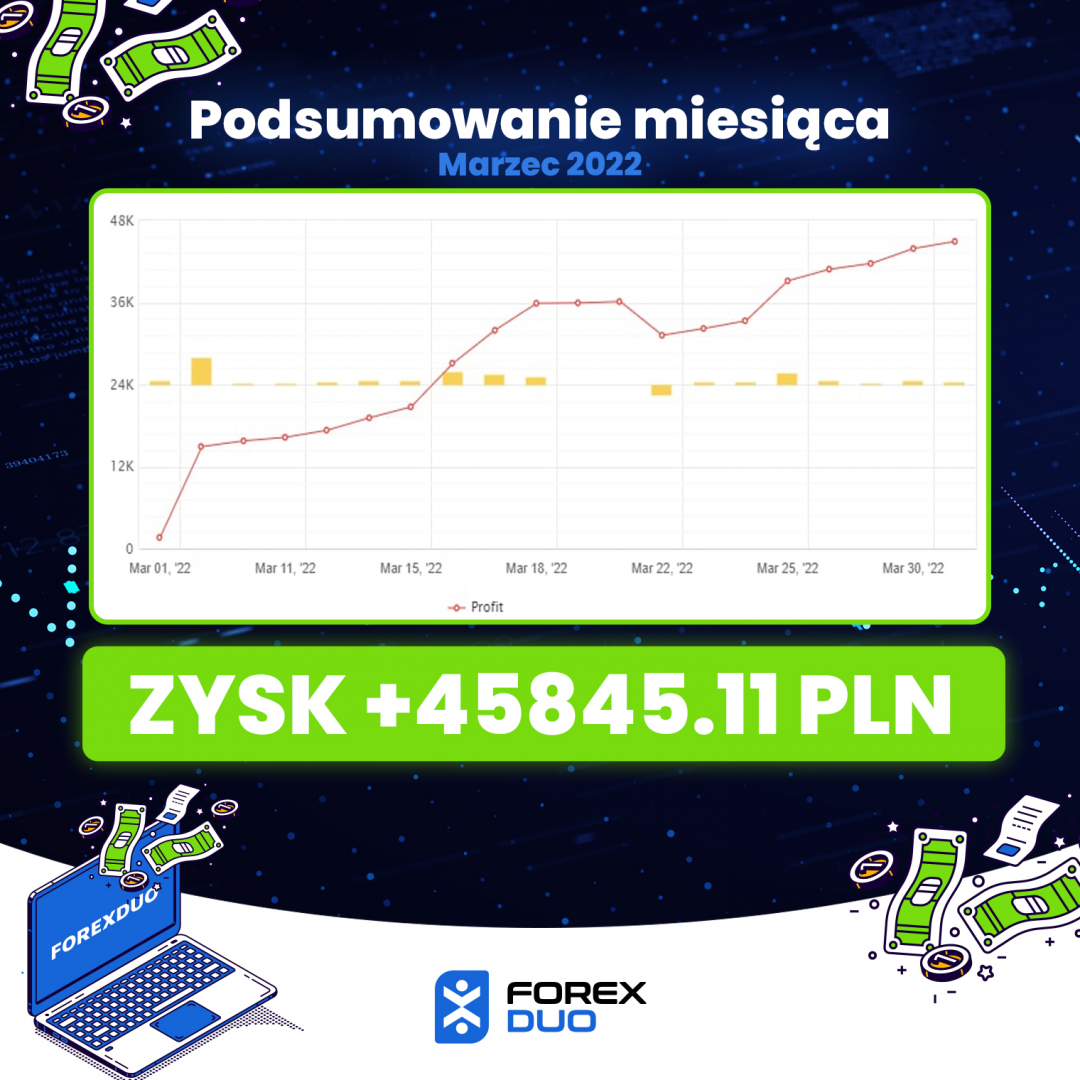 Czas na podsumowanie miesiąca: Marzec zakończył się znacząco powyżej przyjętego planu ~5% miesięcznie. W związku z tym pora przedstawić plan na najbliższy czas. Po dobiciu do ok 200k w saldzie planujemy wypłacać przez jakiś czas nadwyżkę aby dać lepszą możliwość kopiowania z mniejszymi saldami. Trudno powiedzieć przez ile czasu będziemy wypłacać nadwyżkę, jednak będziemy o tym także informować. Jeśli chodzi o samą możliwość kopiowania to nie ma znaczenia jakiego brokera używacie, jeśli macie jakieś pytania to śmiało możecie uderzać z pytaniami: https://t.me/kiljan2 Możemy pomóc w doborze brokera w zależności od potencjalnego depozytu. Link do śledzenia: https://www.myfxbook.com/portfolio/forexduo/8577947 Link do kopiowania: https://www.mql5.com/en/signals/1462168 Do zobaczenia wkrótce!