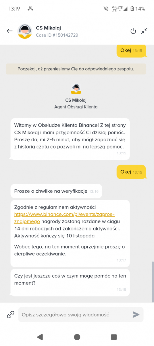 Powiadomienie mi przyszło z tego i dalem dołącz do akcji i żeby kogoś zaprosić potwierdziłem to u 2 osób które dostały to samo i niby działa Proszę Zgodnie z regulaminem aktywności https://www.binance.com/pl/events/zapros-znajomego nagrody zostaną rozdane w ciągu 14 dni roboczych od zakończenia aktywności. Aktywność kończy się 10 listopada Wobec tego, na ten moment uprzejmie proszę o cierpliwe oczekiwanie. 13- 6 odpowiedzi