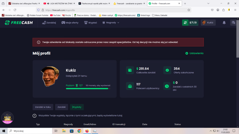 Radzę uważać bo banują za nic, wypłaciłem tam prawie 300 $ bez problemu , zbudowałem baze poleconych dzięki którym zarabiałem , tych ofert nie chciało mi się już zbytnio wykonywać bo z poleconych łapałem ok 20-30$ na miesiąc i sobie wypłacałem , i któregoś dni wpadł ban na konto , próbowałem różnych metod kontaktu, i do dziś się nie dowiedziałem za co dostałem bana. Tylko w koło powtarzanie że ban jest nie odwracalny , dziwny serwis ale cóż. Na chwilę obecną mam tam 70$ których nie mogę już wypłacić. Serwis darzyłem dużym zaufaniem bo sam go tutaj promowałem.