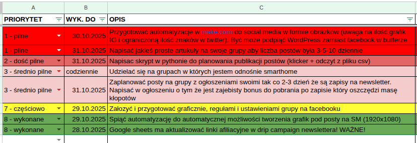 Cześć, przychodzę z małym updatem. Niedawno zdałem sobie sprawę z logicznego problemu, który mam w swoim newsletterze. Nie wiem czy wiecie jak działa w newsletterze Drip Campaign, ale dla tych co nie wiedzą: - działa to tak, że jest to seria emaili z logiką działająca w taki sposób, że od czasu zapisu co jakiś czas (który można ustawić) wysyłany jest e-mail kolejny i kolejny do subskrybeta. Jest to bardzo fajne, zwłaszcza na początku "znajomości" - u mnie działa to tak, że jeżeli subskrybent A zapisze się na newsletter w poniedziałek, dostaje 1 email z dripa w poniedziałek, 2 we wtorek, 3 we środę itd. Natomiast jeżeli subskrybent B zapisze się na newsletter we środę, wówczas 1 email z dripa dostaje w środę, 2 w czwartek, 3 w piątek itp. aż do wykorzystania serii. W ten sposób zapis na newsletter nie powoduje tego, że subskrybent coś przegapi. Dobra rzecz do większej serii emaili. Nazywa "drip" pochodzi od "kapania". E-maile "kapią" na skrzynke subskrybenta. W każdym e-mailu mam tzw. kącik z atrakcyjnymi cenami elementów smarthome, które rzecz jasna mają w sobie linki afiliacyjne. Niedawno do mnie dotarło, że załóżmy jeżeli dziś sie ktoś zapisze i za pół roku dojdzie następny (którys tam) subskrybent, wówczas będzie dostawać linki z kącika niskich cen które moga już być - nieaktualne - niedostępne - z innymi cenami Jest to spory problem, podobnie jak ręczna aktualizacja tego wszystkiego co jakiś czas. Niestety sendy, w którym wysyłam e-maile nie oferuje API do aktualizacji linków w emailach. Na szczęście wcześniej wspomniany kolega Jakub, który też korzysta z Sendy, podpowiedział mi że system ten trzyma wszystkie emaile w bazie MySQL na serwerze. Trzeba się więc umiejętnie podłączyć do bazy, napisać skrypt aktualizujący ceny i przy okazji uważać aby nie "rozwalić" bazy. Na domiar złego, kod jest trzymany w HTML. Dodatkowo w kodzie HTML emaila nie można zrobić wstawek PHP (dynamicznie zmieniających nazwy i ceny). Long story short - zbudowałem mechanizm, który z poziomu arkusza Google Sheets jednym przyciskiem aktualizuje całą bazę dripów i emaili w Sendy. Teraz wystarczy co jakiś czas uzupełnić nazwy, linki i ceny artykułów które mają znaleźć się w emailach i z poziomu jednego kliknięcia przycisku wszystko się aktualizuje. Zajęło mi to dwa dni. Ale działa i oszczędza masę czasu Kolejna rzecz którą się zająłem - marketing. Dziś pozakładałem 8 grup tematycznych w mojej niszy na FB. Poustawiałem wstępne grafiki (dzięki, Grok), reguły, dostępność itp. Konta pod Sociale pozakładane. Niestety trochę tematów pobocznych podochodziło, więc zrobiłem sobie taką ToDo list aby nie stracić wątku i priorytetów co jest ważne a co mało ważne: To tyle na razie ode mnie. Aha, znowu coś tam mi wpadło z klików z grup, także mam już 3,05 PLN Liczę na to, że jak odpalę "marketing" tak jak powinien wyglądać, to będzie lepiej. Dobranoc!1 punkt