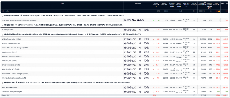 Cześć, od dawna zbierałem się z zamiarem otworzenia własnego bloga/strony czy kanału na Youtube, jednak cały czas mam przed sobą opory także postawiłem na prowadzenie własnego dziennika inwestycyjnego. Swoją przygodę z zarabianiem w internecie zacząłem około 14 lat temu w wieku dokładnie w połowie swojego życia Próbowałem różnych form zarobku od ankiet, sms premium, dropshippingu, aż obecnie inwestowanie w akcje. Bardzo żałuję, że kiedyś nie byłem świadom odnośnie oszczędzania i pomnażania swojego kapitału, co jest również powiązane z ogólnie słabą świadomością Polaków odnośnie zarządzania kapitałem. Inwestować zacząłem od sierpnia 2024 roku. Do tej pory przeczytałem 10 książek odnoszących się bezpośrednio do rynków kapitałowych, psychologii behawioralnej, filozofii. Jednak sam temat jest niesamowicie ciekawy, przynajmniej z mojej perspektywy oraz wymaga sporego rozwinięcia. Na chwilę obecną posiadam własną działalność, która jest moim głównym źródłem dochodu. Jaki mam cel? Głównym celem tego dziennika będzie wyjście ze strefy komfortu jeśli chodzi o regularne pisanie postów i udzielanie się w internecie. Zawodowo zajmuję się fizjoterapią/osteopatią, co wiążę się oczywiście z prowadzeniem mediów społecznościowych i własnej strony internetowej szczególnie jeśli planuję otworzenie w niedalekiej przyszłości własnego gabinetu w dużym mieście. Oczywiście pomnażanie swojego kapitału wraz z rozwojem umiejętności zarządzania kapitałem. Zarządzanie miesięcznym kapitałem: Nie mam stałej wypłaty jednak wahania nie są zbyt duże i każdego miesiąca oprócz wakacji/Bożego Narodzenia wychodzę podobnie (Przynajmniej do tej pory). Jeśli chodzi o oszczędności to podchodzę do tego w następujący sposób. 30 % - Oszczędności - Głównym celem jest ślub w lipcu, następnie odłożenie kwoty, za którą będziemy mogli przeżyć od 6-12 miesięcy. Po osiągnięciu tego celu, będę przeznaczać więcej środków na giełdę, jeszcze nie wiem dokładnie jak będzie to wyglądać. Każdą kwotę, którą zaoszczędzę ponad to przeznaczam na giełdę, jest to moje nowe założenie ponieważ początkowo przeznaczałem na giełdę 500 złotych/msc. Zaoszczędzona gotówka, którą dorabiam sobie w ciągu miesiąca odkładam na rozwój, szkolenia, w przyszłości na Akademię Osteopatii. Podsumowując, przeważnie w ciągu miesiąca jestem w stanie zaoszczędzić około +/- 50% środków. Filozofia inwestycyjna: Do swojego portfela dobieram spółki o wysokiej kapitalizacji, o rosnących zyskach, przychodach i marżach. Na tą chwilę w portfelu mam za dużo spółek w porównaniu do mojego kapitału, który wynosi 10 000 PLN. Jeśli chodzi o dywersyfikację pod względem ilości spółek w portfelu to chciałbym się trzymać takiego założenia: Do 20 000 PLN - 5-6 spółek 20 000 - 50 000 - 6-10 spółek 50 00 - 100 000 - 8-15 spółek 100 000 - 500 000 - 10 -20 spółek 500 000 - # - 20 - 40 spółek Jestem zdania, że nadal jesteśmy w starej hossie, która wg. Johna Templeton'a nie zakończyła się euforią, a cykl kredytowy nie został zresetowany w standardowy sposób. Stąd moje podejście do kupowania akcji firm o wysokiej kapitalizacji ponieważ to one w euforii będą zyskiwać najwięcej. Natomiast w młodej hossie o wiele więcej zyskują młode firmy. Zwracam uwagę również na cykle koniunkturalne oraz prezydenckie, co oczywiście w drugim przypadku jest dzisiaj bardzo dobrze obserwowalne, jednak nikt nie wie jakie stopy zwrotu będą obserwowalne pod koniec tego roku. Nikt nie jest w stanie przewidzieć przyszłości ponieważ bardzo często jest ona wg. mnie losowa Na samo inwestowanie jestem nastawiony długoterminowo, nie spieszy mi się z zyskami, jestem świadom, że mój portfel może obsunąć się o 50%, poza tym nie inwestuje więcej niż mogę stracić. Mój portfel: A więc, przyszła pora na udostępnienie mojego portfela Część z tego portfela posiadam na zwykłym koncie maklerskim, od niedawna przeniosłem swoje konto IKE z Santandera do XTB. Od tej pory będę konsekwentnie zasilać konto IKE. Na tą chwilę to tyle z mojej strony, wstępnie planuję dodawać posty raz w tygodniu, z moimi przemyśleniami oraz raz w miesiącu będę dokonywać wpłaty i komentować swoją decyzję. Pozdrawiam Was serdecznie i życzę wszystkim spokojnego weekendu !9 punktów