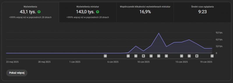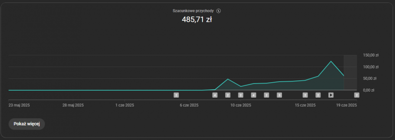 Cześć! Będzie to nietypowy dziennik, bo mimo że w internecie w przeszłości jak i obecnie, zarabiałem na różne sposoby, ten dziennik będzie dotyczył stricte jednej opcji. Mianowicie zarabiania na YouTube przy spełnieniu dwóch głównych zasad: - brak inwestowania w reklamę, wszystko bezpłatnie - brak poświęcania dużej ilości czasu Na moją korzyść działa fakt, że na YouTube zarabiałem do 2021 roku. Potem w życiu zająłem się nieco innymi sposobami na zarobek. Natomiast skuszony zwiększającymi się stale stawkami CPM na YouTube oraz łatwością tego sposobu wracam na YT! Cel tego dziennika dla mnie - motywować mnie do działania w tym kierunku, a dodatkowo w przyszłości chce aby ten dziennik posłużył jako dowód, że da się od zera dojść do dużych kwot, w momencie gdy będę chciał się zająć się dodatkowo mentorstwem dla kilku osób. Mam nadzieje że uda mi się stworzyć dodatkowe źródło dochodu które przy minimalnym nakładzie czasowym będzie rozpędzać się do coraz większych zarobków. 8 czerwiec, DZIEŃ 1 W ten dzień rozpocząłem jakiekolwiek działania. To co potrzebne jest na start to kanał YouTube z włączoną monetyzacją. Opcje są dwie - spełnić wymagania jakimi jest 1000 subskrypcji oraz 4000 obejrzanych godzin lub po prostu kupić konto z włączoną już monetyzacją. Ja zdecydowałem się na drugą opcje. Powód bardzo prosty - zależało mi żeby zarabiać "na już" oraz wiedziałem że inwestycja zwróci się bardzo szybko. W przypadku wbijania wymagań YouTube, nie dość że tracimy czas na wrzucanie filmów na których nie zarabiamy to sama weryfikacja YT potem trwa kolejne dni/tygodnie a na końcu mogą odrzucić wniosek. 8-20 czerwiec DNI 1-12 Kolejne dni to stały schemat. Szukam tego co chce wrzucić, wrzucam do programu, uploaduje na YT i publikuje. Niestety początki są ciężkie. Mamy dosłownie pusty kanał który nikt wartościowy nie subskrybuje a jedyna droga dotarcia do widzów do dobrze otagowany i dopasowany pod algorytmy film który trafi do widza eksplorującego YT. Największy plus mojej niszy filmów jest taki, że nie ma tam potrzeby montażu, wszystko robi się za nas, przez co robiłem to w tle działając na kompie z innymi sprawami. W te 12 dni, wrzuciłem na kanał 26 filmów, czyli średnio 2 dziennie. Jak spojrzycie na grafiki niżej, wrzucałem dosyć nieregularnie, tzn. był dzień gdzie wrzuciłem nawet 5 filmów a były dni kiedy nic nie wrzucałem. Nie ma tu jakiejś większej filozofii, przy takim kupionym pustym kanale i braku reklamy - trzeba iść trochę w ilość a nie jakość. Nie każdy film się przebije, ba! Większość zatrzyma się na kilkudziesięciu, kilkuset wyświetleniach. Ale w końcu któryś zaskoczy, gwarantuje. A przy tych stawkach, wystarczy że jeden film dobrze siądzie i już mamy niezłą kase! 20 czerwiec, PODSUMOWANIE PO 12 DNIACH Czas pokazać jak pierwsze 12 dni wyglądało w statystykach. 8 czerwca wrzuciłem 3 filmy, minęło kilka a nawet bodajże kilkanaście godzin aż cokolwiek ruszyło z zera. Dzień później dorzuciłem kolejne 2 filmy i jak widać po wykresie 9 czerwca na tych 5 filmach udało się zrobić łącznie 3 tysiące wyświetleń. 11 czerwca poświęciłem troszkę więcej czasu na to i wrzuciłem aż 5 filmów w jeden dzień co zaowocowało dużym pickiem wyświetleń. Niestety film który poszybował najwyżej - otrzymał żółtego dolara. Czyli ograniczone zarabianie. Duży pech ale niestety bywa i tak. W kolejnych dniach starałem się wrzucać kolejne filmy, choć bywały dni kiedy nic nie robiłem. Łącznie po 12 dniach filmy osiągnęły 43 tysiące wyświetleń. No i czas pokazać to co interesuje każdego najbardziej. Po 12 dniach szacunkowe przychody wynoszą 485zł. Warto nadmienić że AdSense dla YouTube działa z około dwudniowym opóźnieniem, dlatego wyświetlenia które zrobiłem w tych dniach realnie zarobiły więcej ale w statystykach będą ujęte dopiero 22 czerwca. Analizując wykres - okolice 50zł zarobione już po 2 dniach wyzwania, dzięki wrzuconym 5 filmom na start. Kolejne dni dostarczały dziennie około 30-45zł. Duży peak nastąpił 18 czerwca kiedy to jeden film zaczął być w końcu promowany przez YouTube. Dosłownie znikąd po 3 dniach od wrzucenia zaczął robić bardzo wartościowe wyświetlenia co zaowocowało ponad 100zł w jeden dzień. Największą zaletą YT jest to, że filmy które wrzuciłem zarobiły już, ale co najwaznieższe - one będą zarabiać dalej. A kolejne i kolejne filmy będą dochodzić. Dlatego taki tytuł tego dziennika. Mam nadzieje że uda mi się stworzyć kule śnieżną która będzie karmiła się starszymi filmami a napędzała tymi wrzucanymi na bieżąco. A to wszystko polegając tylko na niszy i algorytmach YouTube, nie inwestując ani grosza poza kupnem kanału. Kolejna aktualizacja myślę w okolicach końca miesiąca, tak aby podsumować czerwiec6 punktów