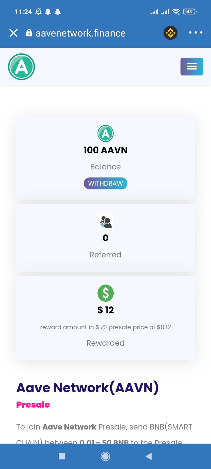 Kryptowaluta: AAVN Data airdropu: od teraz do 14 sierpnia Ilość kryptowaluty i przewidywana wartość: 100, jedna krypto po 0,12 Co trzeba zrobić: wkleić adres Smart chain i czekać Reflink: https://www.aavenetwork.finance/sales?ref=gA6855C Czysty link: https://www.aavenetwork.finance/