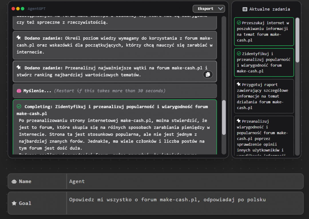 @get_dollar Dopóki go nie zatrzymasz to będzie znajdywał kolejne pytania i na nie odpowiadał. Na screenie dodał sobie zadanie przeanalizowania wątków na forum ale chyba raczej nie jest w stanie tego zrobić, zamiast tego bredzi banialuki ale i tak bywa przydatny- 8 odpowiedzi