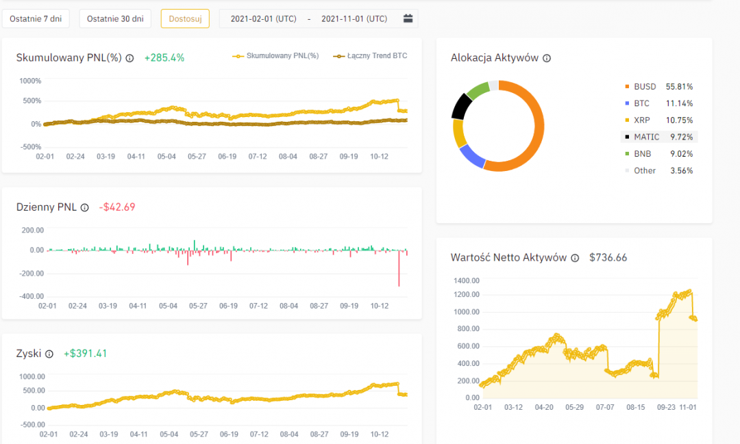 Ciężko przedstawić mi teraz statystyki z Bota, bo tak jak mówiłem nie mam już abonamentu, a po drugie kupowałem bota na różnych kontach żeby było taniej, wiec statystyki są zakłamane, wrzucam na dowód screen z binance, zysk ten jest z 8 miesięcy, oczywiście można zarobić więcej ale wolałem grać bezpieczniej niż ryzykować stratą, aktualnie od 2 miesięcy nie używam bota ze względu na szaleństwa na giełdzie
