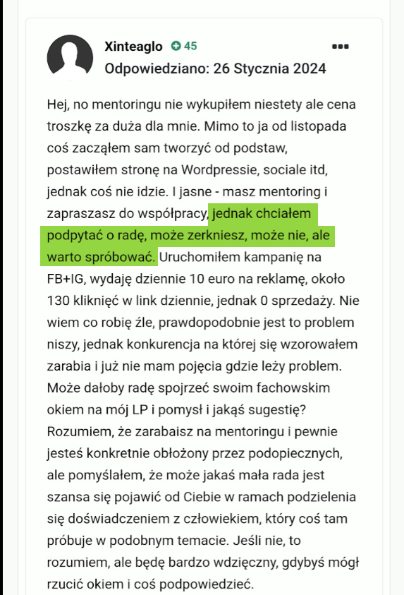 Owszem, byłem zainteresowany mentoringiem bo byłem NA POCZĄTKU swojej drogi zarabiania w internecie. A tak jak na początku bywa - zachłysnąłem się jak baran screenshotami z wyników i chciałem kupić dostęp. NA SZCZĘŚCIE na chłodno chciałem to ocenić i poczekać na opinie - dlatego kilka razy się tutaj udzielałem i pytałem.