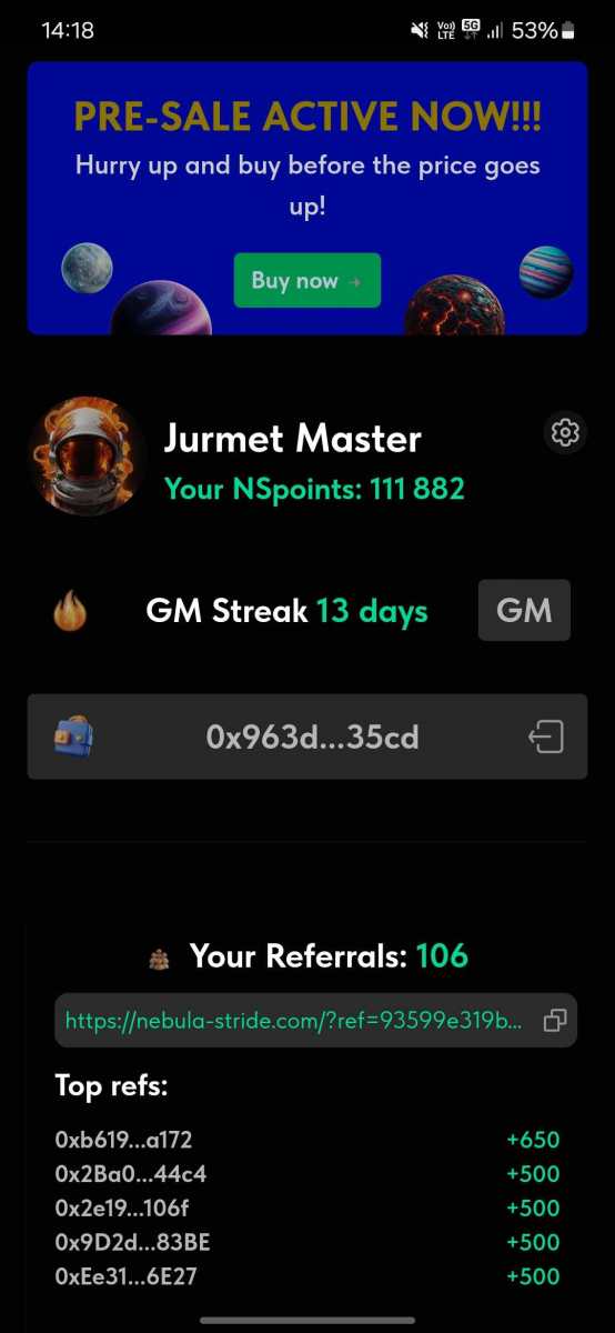 NebulaStride to zdecentralizowana platforma finansowa która zapewnia zestaw usług finansowych do zarządzania aktywami Platforma wykorzystuje swój token NST do zasilania różnych funkcji ekosystemu i mechanizmów nagród. Uczestnicy mogą zdobywać tokeny NST i nagrody poprzez aktywne uczestnictwo w programie np otwieranie skrzynek i mintowanie. Airdrop narazie nie jest ogłoszony. Także można sie wczesnie załapać. Może za jakiś czas coś z tego będzie. Ref: https://nebula-stride.com/?ref=93599e319b22a8f6 Czysty: https://nebula-stride.com