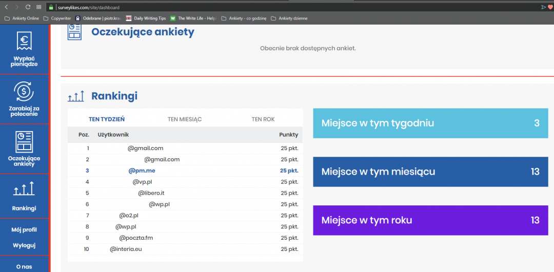 Witam was kochani w ten piękny wieczór. Dzisiaj świętujemy! Udało mi się przekroczyć próg 5 Ojro, potrzebny do wypłaty środków z Clickworker.com Jako iż obiecałem, i by zarazić was pozytywną energią dodałem do zestawu narzędzi ankietera plik z 14 zakładkami dotyczącymi serwisów z ankietami, które należy codziennie wielokrotnie sprawdzać. Miałeś zły dzień? Nie chce Ci się przeszukiwać i organizować zakładek? Jesteś dzisiaj/ostatnio ciepłą kluchą bez energii do niczego? To pobierz stąd zakładki i zacznij działać! Co należy zrobić? Pobrać plik Ankiety codzienne - zakładki do importu na dysk, otworzyć swoją przeglądarkę i wybrać importuj zakładki z pliku/z HTML. Plik zawiera wyłącznie zakładki do 14 serwisów które codziennie oferują ankiety o różnych porach. Import działa na Mozilla Firefox 60+, Opera 40+, Google Chrome, Edge, Internet Explorer 11+. Dziennik Ankietera (plik .xlsx) niestety będzie udostępniony w nowej formie dopiero jutro - dodaje trochę wodotrysków by dane były czytelne i motywowały korzystających z niego do dalszego robienia ankiet. -