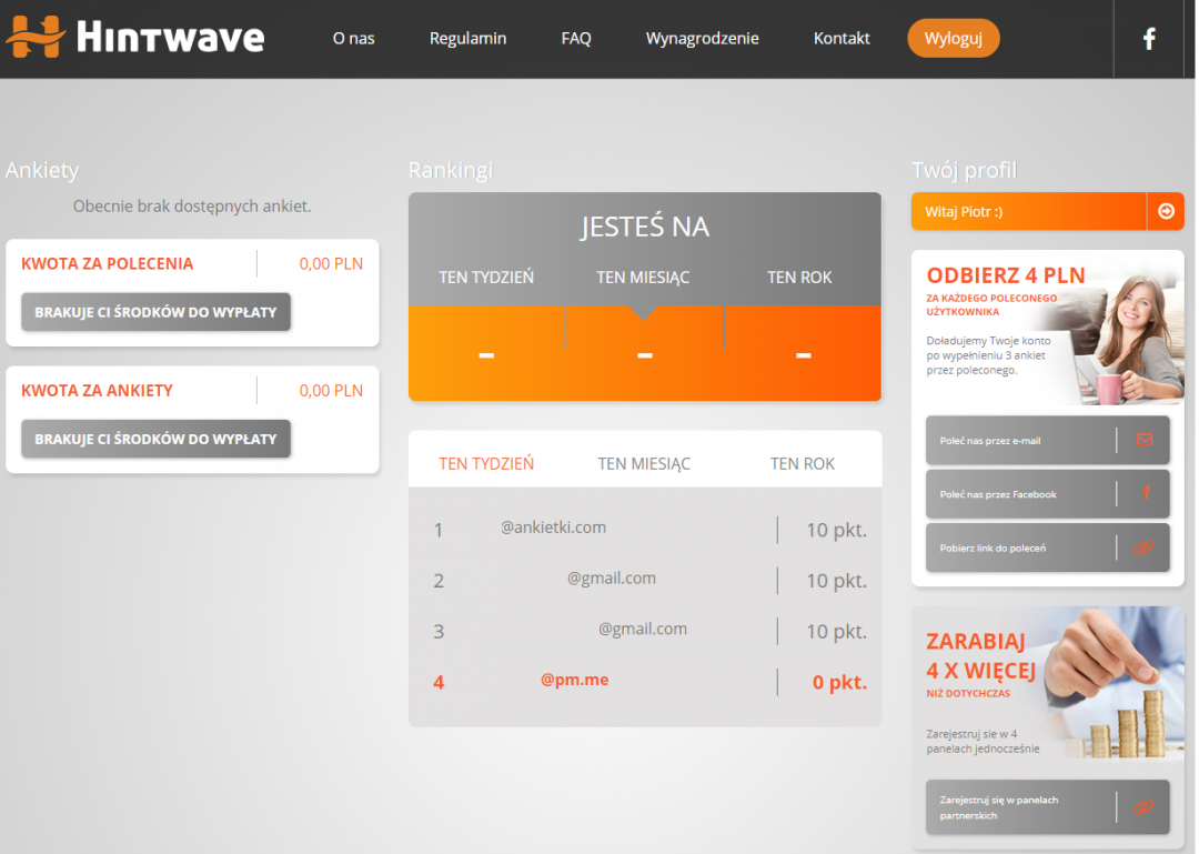 Ten dziennik jest tworzony docelowo, bym nauczył się systematyczności. Znajdziecie tutaj parę moich wynurzeń pseudofilozoficznych, mnóstwo suchych danych i parę (nie)praktycznych porad. Temat wziął się stąd, że jestem fanem RPG i uważam że każda dobra opowieść powinna zaczynać się pokazując protagonistę walczącego ze szczurami, zarabiającym grosze, historiami jak został wykorzystany i jego porażkami. Też lubicie taki styl? To fajnie, ale to nie forum beletrystyczne ? Planuje wypróbować większość lub wszystkie metody zarabiania opisane na make-cash.pl, chyba że wcześniej złapie mnie mój słomiany zapał i rzucę to wszystko w kąt. Cele Krótkoterminowe - Do 06.2019 być w stanie dorobić ok. 1000 zł / mies. w czasie wolnym w celu zaoszczędzenia na lekarzy, dietę i sprzęt do ćwiczeń Długoterminowe - Do 31.12.2019 zaoszczędzić 8000 na wyjazd do Japonii w 2020 roku. - Do 12.2020 być w stanie dorobić ok. 10 000 zł poza obecną pracą, by wyremontować dom, kupić auto, być w stanie raz w miesiącu iść na szkolenie IT a raz w roku wyjechać na 2 tygodnie by pozwiedzać (nie zamierzam cyknąć parę foci i resztę czasu spędzać na plaży - lubię wgryźć się w kulturę i historię). Metody zarobku Aktualnie: Ankiety Online - od 16.02.2019 do 16.05.2019 (termin może zostać wydłużony jeśli "będzie z tego chleb") Wkrótce: Copywriting - planowane od 18.03.2019 (muszę wcześniej posiedzieć nad słownikiem gramatycznym, idiomów i przypomnieć sobie wszystkie zasady gramatyczne i stylistyczne) CPA, Afiliacja - planowane od 15.04.2019 (muszę przeczytać od deski do deski poradniki CPA) Inne - planowane od ??? Ankiety online - modus operandi W chwili obecnej jestem zarejestrowany na 30 serwisach z Ankietami Online. Powodem jest motto "ilość staje się jakością samą w sobie, gdy liczby staną się odpowiednio duże". Innymi słowy staram się być zarejestrowany na jak największej ilości serwisów celem zwiększenia ilości otrzymywanych ankiet i w wyniku tego - zarobków. Zakładam, że ilość serwisów zwiększy się w ciągu najbliższych tygodni. Ilość ta jednak spadnie po 3 miesiącach od rejestracji, ponieważ przyjąłem zasadę: serwisy z których nie jestem w stanie wypłacić lub uzbierać przynajmniej 50% środków potrzebnych do wypłaty w ciągu 3 miesięcy od rejestracji zostają skasowane. Ankiety online - od czego zacząć? Pierwsze co to przeczytaj ten poradnik, a następnie... Ustalenie filozofii Jeśli zdecydowałeś się podobnie jak ja rozpocząć swoją przygodę z zarabianiem online od ankiet, musisz w pierwszej kolejności odpowiedzieć sobie na jedno, zajedwabiście ważne pytanie: Czy zamierzam je robić uczciwie - zgodnie z prawdą, czy w celu zarobienia jak najwięcej będę kłamać? Ja wybrałem bycie w 100% uczciwy i nie upiększanie swojego profilu ani odpowiedzi w celu zwiększenia szans na zakwalifikowanie się do ankiety. O co chodzi? Na wielu serwisach, zanim przejdziesz do ankiety będziesz musiał uzupełnić swój profil informacjami lub przejść przez swego rodzaju pre-ankietę sprawdzającą czy pasujesz do profilu kandydata którego odpowiedzi potrzebują. Po tygodniu ankiet mam hipotezę: kobiety powinny otrzymywać więcej ankiet od mężczyzn, jeśli pracujesz i zarabiasz więcej niż 40,000 zł brutto rocznie i masz wpływ na każdą dziedzinę w Twoim zakładzie pracy, masz partnera i dzieci, własny dom oraz samochód otrzymasz więcej ankiet. Jako zaprzeczenie wszystkiego co podałem uważam że miałem mniej okazji by zarobić - z ponad 100 ankiet, których podejmowałem się w tym tygodniu ponad 90% zostało odrzuconych (albo to takie piękno GreenPanthera, który odrzucił moją kandydaturę z 50 na 51 ankiet). Dlaczego wybrałem bycie uczciwym? Po pierwsze w przeszłości miałem problemy z byciem prawdomówny i w zeszłym roku obiecałem sobie że nie będę kłamał - nigdy. Chcę odzyskać kręgosłup moralny i odzyskać szacunek do siebie samego dlatego trzymam się tego jak tonący brzytwy. Drugi powód jest pragmatyczny - nie wiem czy serwisy porównują dane zapisane w profilu z danymi wprowadzonymi w ankietach. Jeśli tak i zauważą niekonsekwencję, moje konto z uzbieranymi środkami zostanie usunięte. Trzeci powód jest logiczny - nikt nie będzie płacił za farmazony. Jeśli firma ankietująca zauważy, że duży odsetek ich ankieterów miało w życiu każdą możliwą chorobę, zarabiają po 100,000 zł miesięcznie netto, mają po 3 auta, 5 domów, 10 dzieci itd., a ich partnerzy nie wypłacają im kasy za całe transze ankiet to serwis zostanie zamknięty. Straci całe społeczność ankieterów, W TYM TY! Ostatni powód jest natury moralnej. Zapytałem sam siebie - jaka jest cena mojej prawdomówności? Czy aby zarobić 50-200 zł miesięcznie (jak pokazuje @chincyk może być to i 4 razy więcej) jesteś gotów poświęcić swoją prawdomówność? Odpowiedź mi się nie do końca spodobała: Nie, ale ale za 3000 zł /mies. to całkowicie inna sprawa. Muszę popracować jeszcze nad swoim kręgosłupem moralnym. Przygotowanie warsztatu Chcesz by praca szła Ci przyjemniej? Chcesz wszystko lepiej pilnować? Przyda Ci się parę narzędzi: Osobna skrzynka e-mail Działając na ankietach online może z czasem wpadać na skrzynkę dużo spamu. Tak, możesz to ograniczyć korzystając z "ankiety+nazwa_skrzynki@domena.xyz" ale za którymś razem się pomylisz i otworzysz bramy dla spamerów. Lepiej utworzyć osobną skrzynkę za czasu. Pomoże Ci to także łatwo wyszukać wiadomości o nowej ankiecie. Ja korzystam z ProtonMail i polecam ją również wam - 500 mb na wiadomości w wariancie darmowym w pełni wystarczy. Dziennik ankietera Nie chodzi mi o dzienniki takie jak ten, który właśnie czytasz (naprawdę, nadal to robisz? Idź lepiej poczytać o CPA, PPA i niszach!) tylko o plik w którym będziesz zapisywał wszystkie wykonane ankiety. Po co? Bo skoro ju