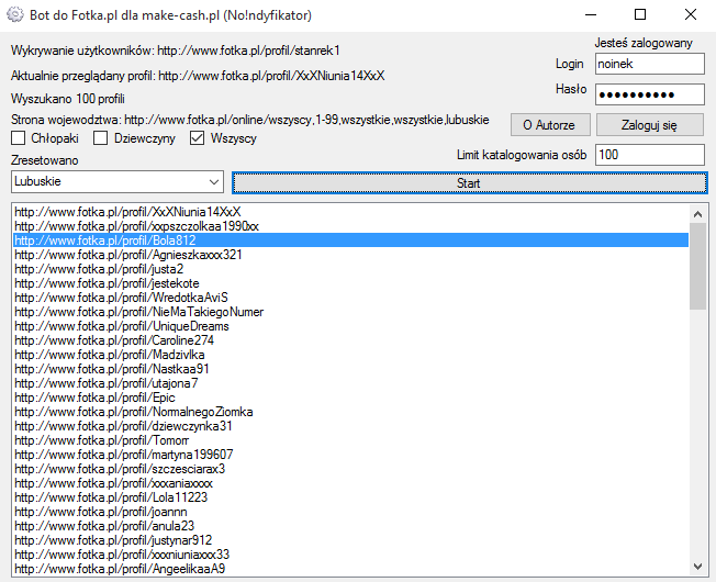 1.Nazwa przedmiotu : Bot do serwisu fotka.pl nabijający odwiedziny Twojego profilu 2.Opis przedmiotu : Sprzedam bota do serwisu fotka.pl bot ma na celu zwiększenie liczby osób, które odwiedzają Twój profil. Bot działa na zasadzie że wyszukuje osoby które są w danej chwili on-line, wchodzi na ich profil. W tym momencie osobie, która jest on-line pokazuje się, że ktoś odwiedził jej profil, i ona z ciekawości odwiedza Twój profil. Bot sprawdzony, działa, testowany przez 2 osoby aktualnie, bez zastrzeżeń. Możliwość wyboru płci, województwa oraz limitu katalogowanych osób do odwiedzenia. Program w ciągu godziny odwiedzi około 1200 profili. Średnio 3 sekundy na profil aby odwiedzenie zostało zaliczone. 3.Źródło pozyskania: Program mojego autorstwa 4.Zdjęcia : 5.Kontakt : Poprzez forum ( PW ) 6.Cena : 60 zł 7.Sposób zapłaty za przedmiot : Przelew na konto bankowe