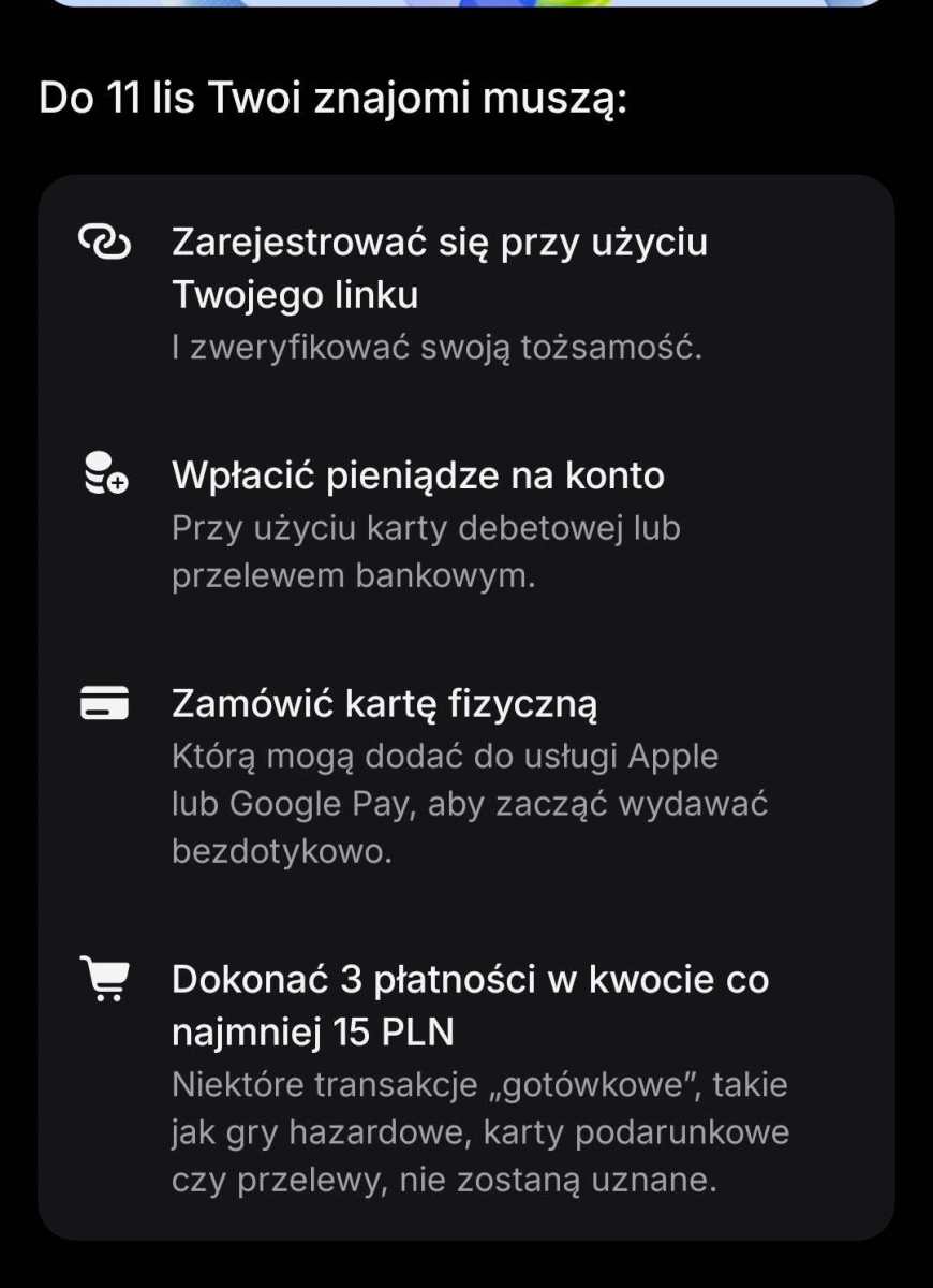 1. Oczekuję: Rejestracja z linku Weryfikacja tożsamości Zamówienie karty darmowej Revolut i jej późniejszą aktywacja 3 płatności po 15 pln kartą w sklepie lub w sieci Skorzystaj z poniższego linku: https://revolut.com/referral/?referral-code=michas24q!NOV1-25-AR-H4&geo-redirect https://revolut.com/referral/?referral-code=lukaszpiotr_p!NOV1-25-AR-H3&geo-redirect 3 płatności po 15zł minimum każda. Można kupić PSC na allegro za 20zł i wymienić je na skrilla. (Ewentualnie) https://revolut.com/referral/?referral-code=lukaszpiotr_p!NOV1-25-AR-H3&geo-redirect 2. W zamian oferuję: 120 pln 3. Czas oddania refbacku: Instant lub po określonym czasie 4. Kontakt: TELEGRAM PEARCEMARTYN Forum Make Cash 5. Forma wypłaty refbacku: Waluta FIAT PLN 6. Data zakończenia promocji z której korzystasz: 11 LISTOPADA 7. Gwarancja zwrotu kosztów w przypadku niepowodzenia: ROBISZ NA WŁASNĄ ODPOWIEDZIALNOŚĆ 8. (opcjonalnie) Dodatkowy opis oferty: ZALOZ KONTO REVOLUT Z JEDNEGO Z LINKÓW PODESŁANYCH I ZGARNIJ 120 PLN (PAMIĘTAJ O KROKACH DO BONUSU) (TYLKO NOWI UŻYTKOWNICY REVO)