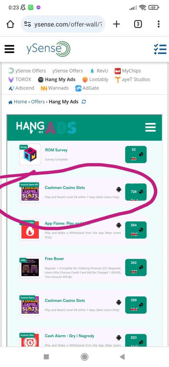 Wchodząc w offers a następnie panel hang my ads mamy grę cashman cas.ino. Za wbicie 15 lvl dostajemy 7$, co zajmuje 10 min, za 28 lvl otrzymamy kolejne 7$. Całość przy dobrych wiatrach zajmuje 30 min.