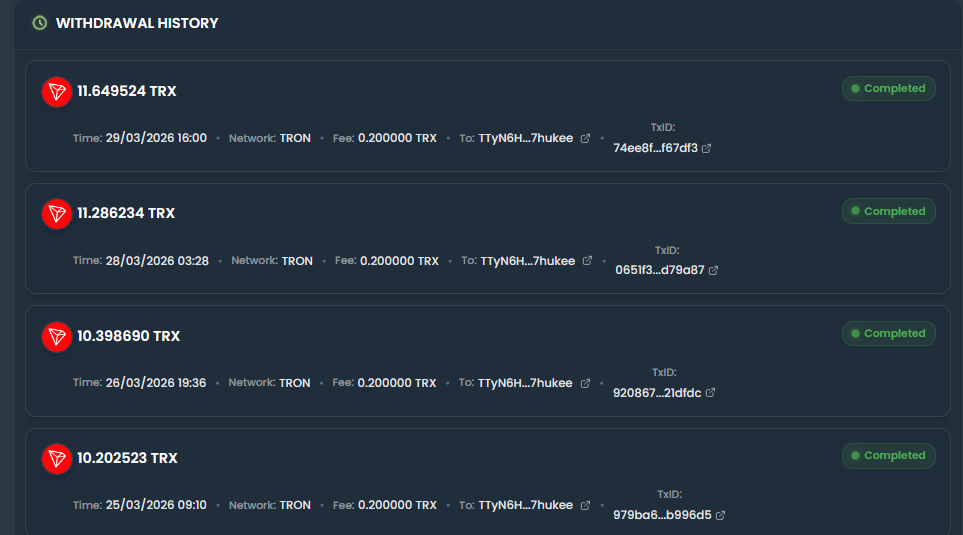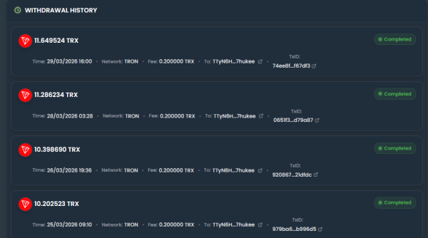 Dołącz do TronKong i zacznij zarabiać TRX online! Szukasz miejsca, gdzie możesz zdobywać darmowe TRX w prosty sposób? Na TronKong masz kilka możliwości zarabiania w jednym miejscu: Faucet (Claim TRX) - odbieraj darmowe TRX co określony czas Gry online - zwiększaj saldo, grając i podejmując wyzwania System poziomów i bonusów - im większa aktywność, tym większe nagrody Program poleceń (referral) - zarabiaj dodatkowo na aktywności zaproszonych osób Szybkie wypłaty (instant payouts) - po uzbieraniu minimalnej kwoty możesz wypłacić TRX bez długiego oczekiwania. Panel użytkownika pozwala śledzić zarobki, historię wypłat i bonusy. Jeśli jesteś aktywny codziennie, możesz systematycznie zwiększać swoje saldo i korzystać z dodatkowych promocji dla stałych użytkowników. Zarejestruj się tutaj i zacznij działać: https://tronkong.live/?ref=MarcinKuma Czysty link: https://tronkong.live Im więcej aktywności, tym większy potencjał zarobku Uwaga!!! Jestes moim poleconym i Masz wlaczony komputer i nie chcesz samemu klikac co godzinę a wolisz by robiło to automatycznie napisz do mnie podajac nick pod jakim sie zarejestrowales a udostepnue program który robi to za ciebie. Skrypt jest niewykrywalny i mojego autorstwa.