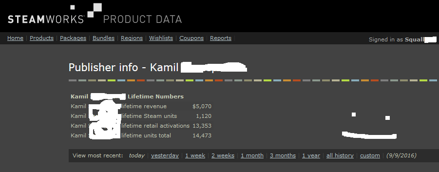 Ouuuukeeeey, Witam ! Chyba czas uchylić rąbka tajemnicy z zarobku na Steam'ie Myślałem nad założeniem oddzielnego dziennika dotyczącego tylko mojej gry, ale sobie tak myślę ( jak dziennik gościa od wszystkiego ) to można napisać i tutaj Albo i walnę wam może screena? Jak widać na PPA więcej zarabiają Dla niekumatych : xD Zarobek Brutto : 5,070$ Kupna na Steamie : 1120 Aktywacji Gry poza Steam : 13,353 Ogólna ilość osób posiadających naszą grę : 14473 No dobra, aby nie było tak kolorowo że zarobiliśmy 5k dolarów to odejmijcie od tego 30% Tyle pobiera Steam mniej więcej. + Odejmijcie Polski podatek który musiałem od tego odprowadzić ( wolałem odprowadzać, zamiast kiedyś tam się zdziwić ) Więc nie zostaje za dużo, do tego podzielcie to na pół bo we dwie osoby gra była tworzona Oczywiście to nie jest nasz cały dochód z gry ponieważ zawieraliśmy umowy z przeróżnymi firmami na to aby nasza gra mogła znależć się w promocyjnym pakiecie BUNDLE co jest bardzo opłacalne. Gra zyskuje jakiś rozgłos + dostajesz pieniądze, czasami większe niż na Steam pomimo ceny 1$ za grę. Więc kilka tysięcy dolarów również doszło Niestety teraz już gra jest starsza ( wyszła w lutym ) i schodzi tylko gdy damy ją w promocji ( wtedy łatwiej ją znależć, jest bardziej na wierzchu ) Czyli najważniejszy jest marketing! Okey a więc dla innych którzy nie widzieli gry zapraszam do kupna, obejrzenia czy co tam chcecie : http://store.steampowered.com/app/440950/ Aktualnie kończymy pracę nad DLC które moim zdaniem fajnie nam wyszło Pozdrawiam wszystkich forumowiczów xD Hmm co by tutaj, dodać? Wczorajsza dniówka na AstroCashu to 41centów Do następnego wpisu! PS: Właśnie dostałem BANA na Addmefast