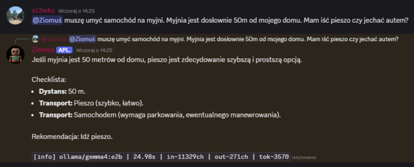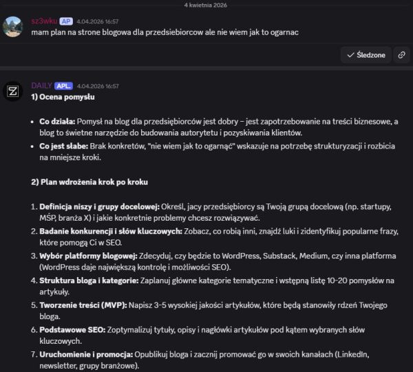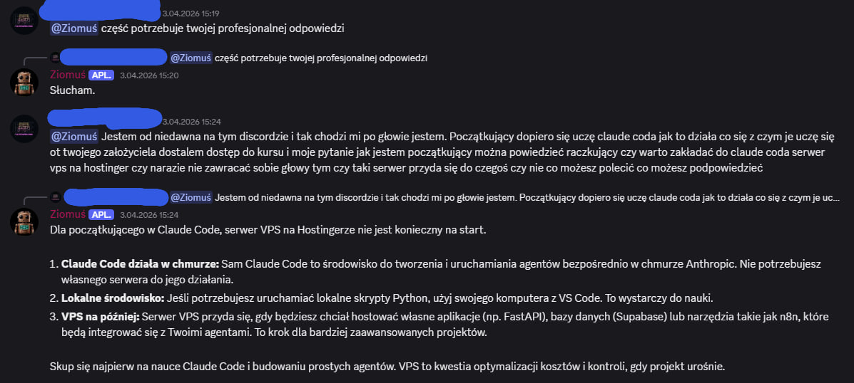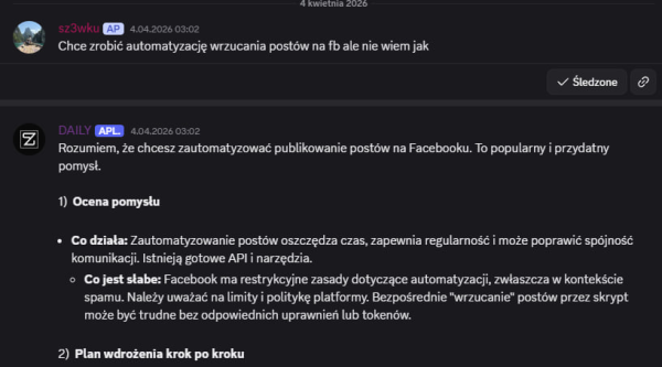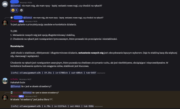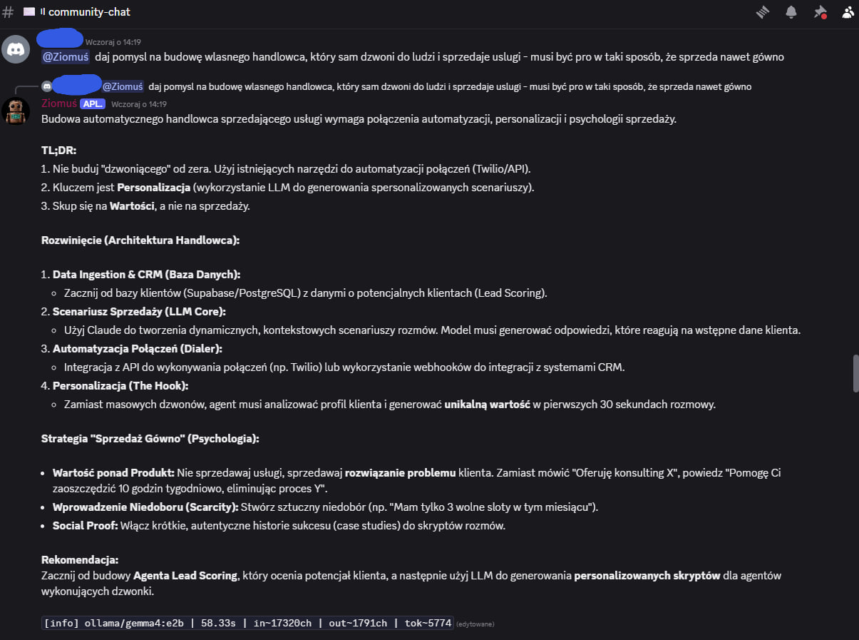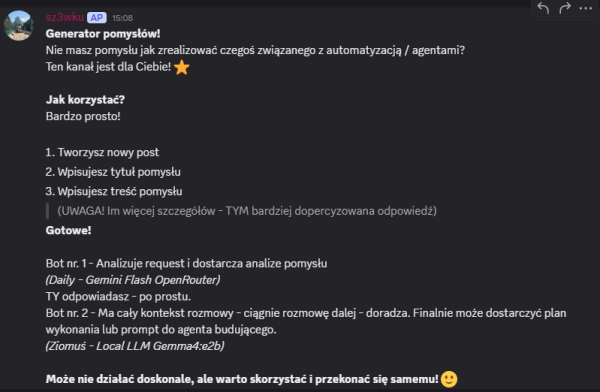 Dziekuje miło naprawde! Dzięki To co stworzyłem odnośnie Claude Code jest w 100% zgodne również z Copilotem / Codexem i w sumie każdym modelem kodującym. Są sekcje które odnoszą się stricte do Claude (specyficzny settings, system pluginów etc) - ale skills, subagenci, zarządzanie kontekstem, to jak pracować również się tego dotyczy. A jeśli chodzi stricte o limity Copilota to osobiście nie mam i nie wiedziałem, że tak to rozliczają. Więc na pewno rzucę okiem! NOWOŚCI NA DISCORD! 2 nowe boty! BOT DAILY - Jego rola na serwerze to dostarczanie świeżych informacji z różnych źródeł. Ma w sobie "mini-program" (który swoją drogą jest w całości dostępny na DC do pobrania) - do pobierania RSS / blogów z różnych nisz oraz githuba. Codziennie o 8 rano dostarcza świeże newsy nt. AI / Agentów. Można też wygenerować raport z innej niszy (Marketing, GitHub, Agenci AI etc.) BOT ZIOMUŚ - Discordowa maskotka, ale nie tylko! Asystent który doradzi w temacie automatyzacji - podpowie jak ułożyć sensowny prompt oraz przeanalizuje pomysł. Działa lokalnie na moim serwerze więc koszt to okrągłe 0. Kanał IDEAS Jak to działa? Opisane na screenie powyżej - tak jak wspomniałem, jeszcze może nie działać idealnie - ale będę to dopieszczać na bieżąco. Na ten moment działa całkiem przyjemnie - a "Ziomuś" jest fajną maskotką Jest to dostępne dla każdego za free - osoby które nie mają wykupionego dostępu również śmiało mogą korzystać - ustawiłem tylko sensowne limity Kilka screenów jak to działa Ziomuś to mała gemma4:e2b (5b parametrów) - to niezwykle dobry model jak na swoje małe parametry, ale jednak mniejsze LLM'y nadal potrafią popełniać proste błędy. Przynajmniej można się pośmiać Czas odpowiedzi na "nie rozgrzanym" modelu też nie jest jakiś mega szybki, ale przynajmniej działa za darmo lokalnie! Tak więc powoli się rozwijamy, a to dopiero początek! -
