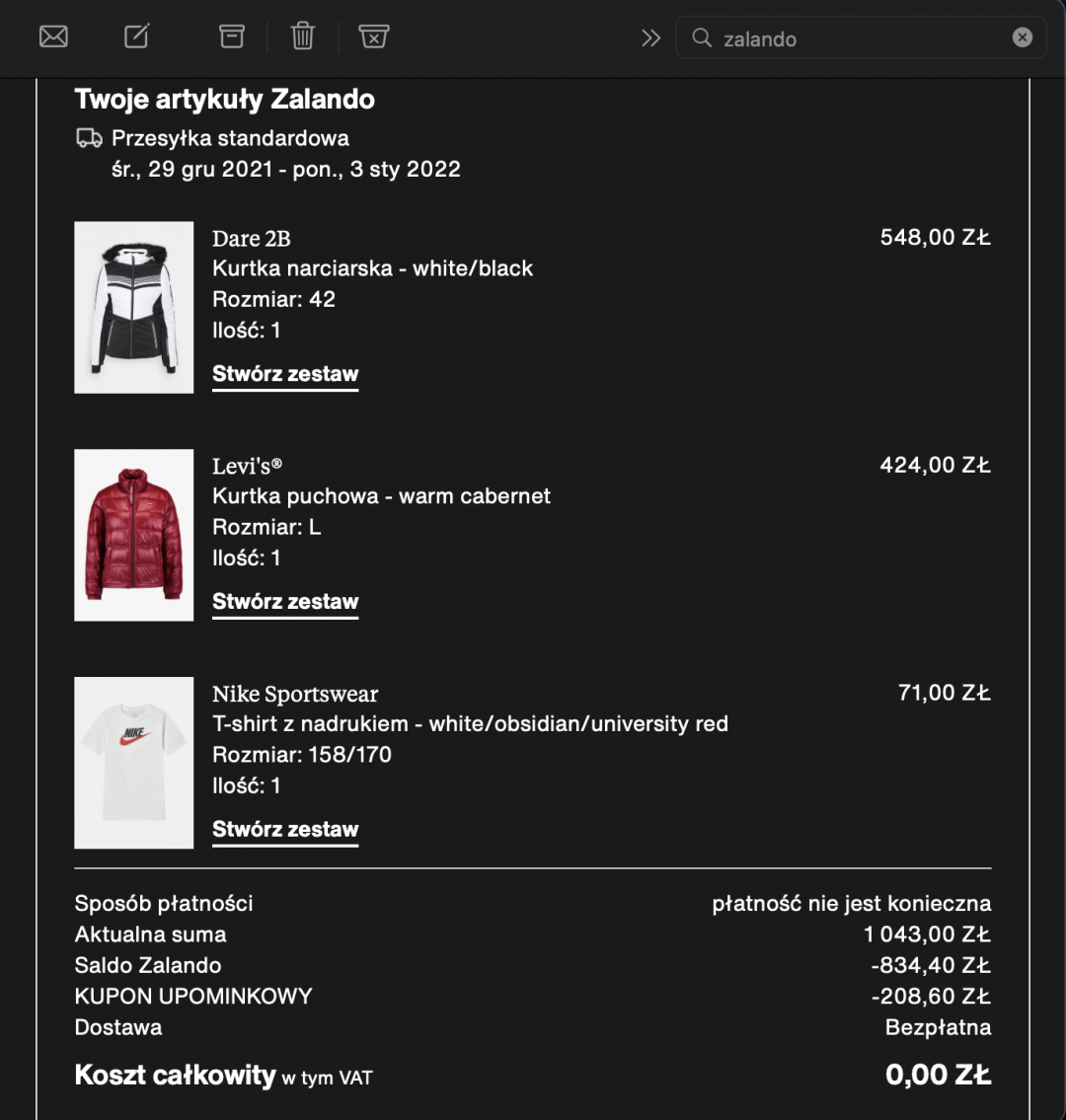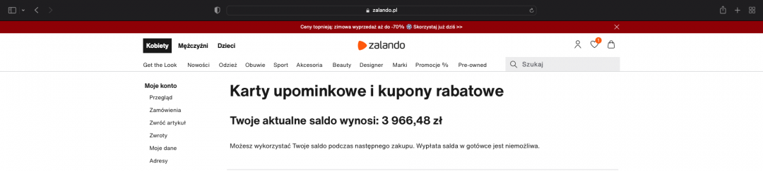 1. Nazwa przedmiotu: Zniżka na cały asortyment Zalando.pl 2. Opis przedmiotu: Oferuje proxy na cały asortyment z zalando.pl -30% na cały asortyment !!! Zamówienie przechodzi przez moje konto, opłacam je środkami z zalando, paczka leci prosto do ciebie do domu. 3. Źródło pozyskania: własne 4. Zdjęcia: przykładowe zrealizowane zamówienie: saldo na karcie: 5. Kontakt: forum/telegram/fb 6. Cena: wartość koszyka - x% 7. Sposób zapłaty: blik/wyplata blik/revolut/mbank
