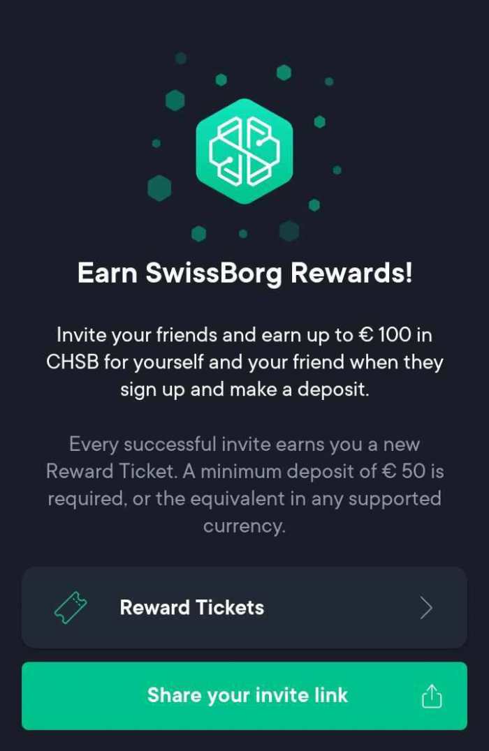 SwissBorg – Bonus do 100 Euro za depozyt 51 Euro! 1️⃣ Rejestrujemy się z linku 2️⃣ Weryfikujemy konto KYC. 3️⃣ Wpłacamy depozyt co najmniej 51 Euro lub równowartość w innej walucie lub kryptowalucie. 4️⃣ Klikamy „Claim Your Reward” 5️⃣ Otrzymujemy losowy bonus o wartości do 100€ w tokenie CHSB. 6️⃣ Wymieniamy nasz Bonus na dowolną kryptowalute lub fiat i wypłacamy odrazu całość razem z naszym depozytem. -