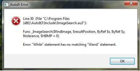 witam napisałem sb takiego bocika na podstawie imagesearcha Func aaa()ExitEndFuncHotKeySet("{ESC}", "aaa")$i = 0While $i > 100sleep(5000)#include <ImageSearch.au3>Global $x, $y$result = _ImageSearch("polik.png", 1, $x, $y, 10)If $result = 1 ThenMouseClick("left", $x, $y, 2)Sleep(50000)EndIfPixelSearch(848, 485, 1060, 485,0xD60000)If Not @error ThenMouseClick("primary",951, 439,1)EndIfSleep(500)WEnd ale wyskakuje mi błąd. co tu mam poprawić?