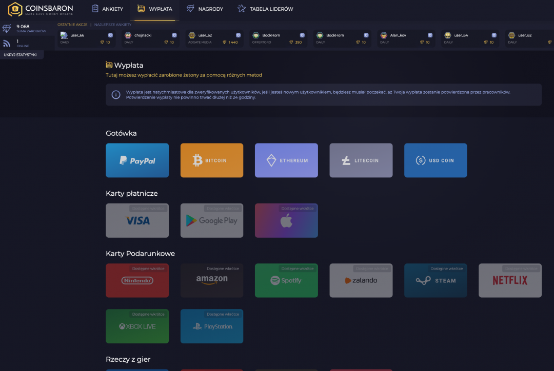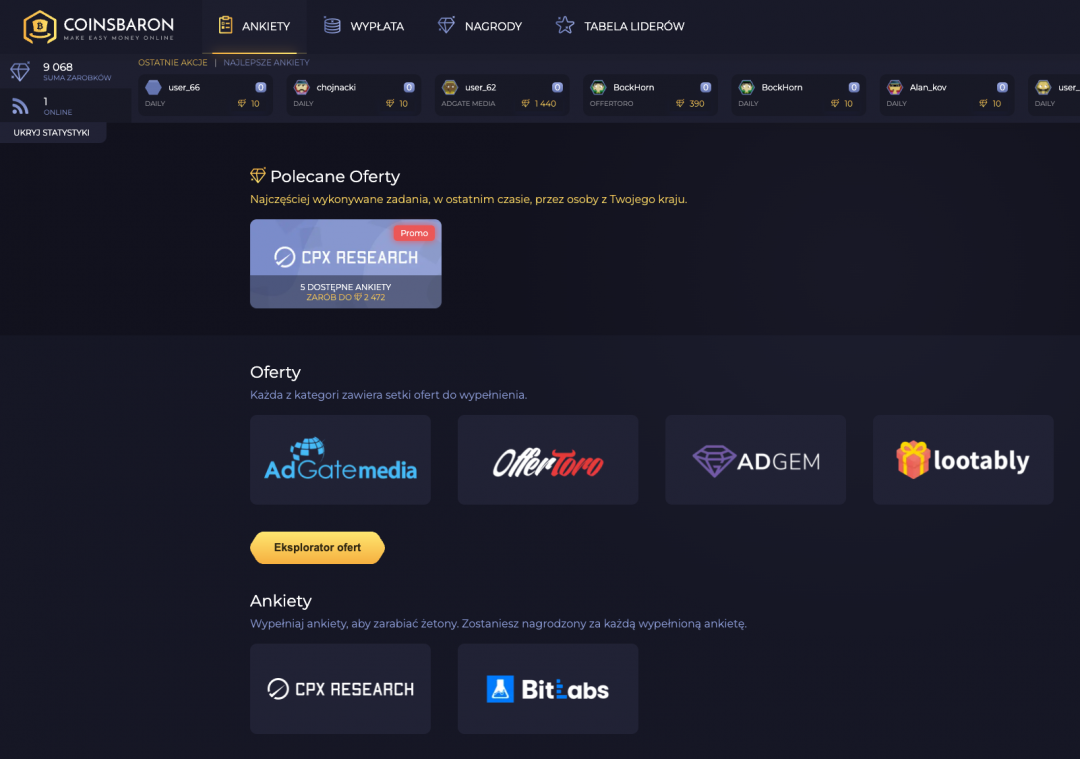 Coinsbaron.com (https://coinsbaron.com/pl) jest serwisem na którym możesz zarabiać, współpracującym z najlepszymi firmami oferującymi badania marketingowe oraz offerwalle. Wypełniaj ankiety lub zadania na komputerze lub urządzeniu moblinym. Zarejestruj się używające linku: https://coinsbaron.com/r/free i odbierz darmowe coinsy! Dostępne offerwalle: AdGatemedia OfferToro AdGem Lootably CpxResearch Bitlabs ayetstudios (Wkrótce) Dostarczamy Ci najlepsze oferty oraz ankiety, które możesz robić w swoim wolnym czasie aby zarobić żetony. Żetony te mogą zostać użyte do wypłaty gift cardów, kryptowalut oraz gotówki na paypal. Dostępne metody wypłat: Paypal Bitcoin ETH LTC USD Coin Karty płatnicze (wkrótce) Karty podarunkowe (wkrótce)