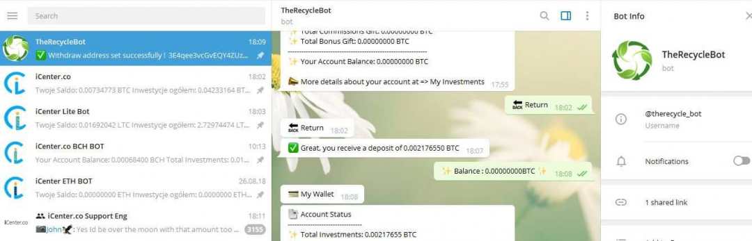 ?Wstęp: Moi drodzy, czytajcie cały temat. Każdy kolejny post to aktualizacja co nowego w programie. Pozdrawiam. Drogi czytelniku. Poniższa recenzja zarabiania jest subiektywną oceną firmy The Berlin Group Pty Ltd i ich bota. Przeczytaj uważnie poniższą recenzję i po podjęciu DECYZJI o początku zarabiania i dołączeniu do programu, skontaktuj się ze mną mailowo lub poprzez wiadomość prywatną na forum. Obierzemy odpowiednie strategie działania, abyś nie czuł się osamotniony, jeśli jesteś początkujący w świecie zarabiania online. Ze wszystkim sobie poradzimy.? ✅Crypto Growth Bot opiera się o aplikację Telegram Messanger. Służy on do komunikacji biznesowej, między firmą, a klientem i za jego pośrednictwem obsługujemy nasze kontoi zarabiamy. ?Admini zapowiadają osobną aplikację na Android i iOS, oraz portal internetowy.? STATYSTYKI 24.11.2018! ✨ Total Users : 32667 ✨ Active Users : 8065 ➖➖➖➖➖➖➖➖➖➖➖➖➖ ✨ Bitcoins ✨ Total Active Transactions : 9213 ✨ Total Active Recycle : 122861 ✨ Total Withdrawals : 35249 ✨ Sum of Withdrawals : 625.49606351 ➖➖➖➖➖➖➖➖➖➖➖➖➖ ✨ Litecoins ✨ Total Active Transactions : 4141 ✨ Total Active Recycle : 48324 ✨ Total Withdrawals : 12519 ✨ Sum of Withdrawals : 12186.58379701 ➖➖➖➖➖➖➖➖➖➖➖➖➖ ✨ Ethereum Coins ✨ Total Active Transactions : 3814 ✨ Total Active Recycle : 59821 ✨ Total Withdrawals : 13378 ✨ Sum of Withdrawals : 3140.13856587 ?Nazwa programu: Recycle Super Bot / Crypto Growth Bot ?Data startu: 22.07.2018r ✏️Plan zarobkowy: 2.8% dziennie przez 60 dni ROI 168% ???Program polecający: 3 poziomy: 10% 3% 1% ?Dostępne procesory płatnicze: BTC ETH LTC DEPOZYTY PRACUJĄ W WYŻEJ WYMIENIONYCH KRYPTOWALUTACH ➕Minimalny_depozyt: 0.003 BTC 0.03 ETH 0.2 LTC ➖Minimalna kwota do wypłaty: 0.003 BTC 0.03 ETH 0.2 LTC ?Wypłaty: INSTANT ?Opis programu(legenda): ♻️Crypto Growth Bot jest botem telegramu, który dostarczył jedną z PIERWSZYCH możliwości inwestycyjnych w kryptografii wspieraną przez dobrze znaną, wartą wiele milionów dolarów australijską spółkę The Berlin Group (ABN 46 604 311 300) z biurami zlokalizowanymi w Suite 34/1 Ricketts Road Mount Waverley, Victoria Australia 3149, z prawdziwymi ludźmi (CEO Joachimem Gerhardem Wernerem Pydde), prawdziwym biznesem i szlachetną sprawą, która przyniesie korzyści dla przyszłości całej ludzkości. Ich oficjalna strona: http://theberlingroup.com.au/ gdzie możecie przeczytać o inwestycjach firmy, planach na przyszłość, zobaczyć dokumenty potwierdzające transparentność, a w najbliższych dniach, ma zostać nagrany film pokazujący biuro firmy oraz teren gdzie rozpoczynają się prace nad budową zakładu recyklingu w Australii. Co bardzo ciekawe, firma wypuściła już 3 boty! Jest też bot [BCH, ETC, DASH] oraz bot [XRP, XMR, ZCASH], które również dają możliwość mnożenia krypto 2,8% dziennie przez 60 dni. ?Przychody: ?Firma czerpie dochody z DYSTRYBUCJI KAWY oraz redukcji składowania i recyklingu materiałów, aby produkować tanie mieszkania i utrzymywać czystość oceanów, mórz i dróg wodnych. Niektórzy mogą nie wiedzieć, ale w Australii kładzie się duży nacisk na ekologię, recykling i mają tam wielu zwolenników dbania o naszą planetę. ?Źródła zarobku: ?Twoja inwestycja nie tylko zapewnia rozwój, ale także przyczynia się do czystości planety, która jest zaśmiecana przez każdego z nasz, każdego dnia. Na oficjalnej stronie można przeczytać RACHUNEK ZYSKÓW I STRAT za ostatni rok. JAKO JEDYNA FIRMA TEGO TYPU OFERUJE 15 DNIOWY OKRES PRÓBNY. W PRZYPADKU NIEZADOWOLENIA ODDAJĄ CI PIENIĄDZE, JEDNAK NIE MOŻESZ PÓŹNIEJ DOŁĄCZYĆ PONOWNIE PRZEZ 60 DNI. Poniżej przedstawiam głównych adminów projektu, z którymi można się skontaktować i rozmawiać. Zespół administratorów jest jednak o wiele większy. Dyrektorem naczelnym The Berlin Group i The Recycle Bot jest Joachim GW Pydde, który pochodzi z Niemiec, jest jednak pełnym obywatelem australijskim i posiada australijski paszport. Firma posiada stronę przeznaczoną i zlokalizowaną w Geelong, którą planuje przenieść do wkrótce, również w Victorii w Australii. CEO: Joachim Gerhard Wener Pydde Executive Operations Manger: Laurie Suarez CMO/ Chief Marketing Officer: Peter Ohanyan Directorship for The Berlin Group: Mr John Foley ?Oficjalna strona: >>> http://theberlingroup.com.au/ <<< ??Moja opinia i informacje o moim zespole: Mamy dziś 18.10.2018. Pierwszy minimalny depozyt zrobiłem 27 sierpnia na kwotę 0.002 BTC. Jak to wygląda dzisiaj? W obiegu mam blisko 0.6 BTC, inwestując jedynie 0.04 BTC. Mój zespół liczy 165 osób, z czego 41 to aktywni inwestorzy. Dokonali depozytów na łączną kwotę blisko 7.7 BTC, 46,5 LTC i 7,41 ETH co daje nam kwotę około 200 000 zł przy dzisiejszym kursie. Poniżej zrzut ekranu z dokładnymi danymi: ?Mamy super społeczność około 200 osób na FB, a także na naszym czacie Telegram. Znajdziesz nas na FB wpisując RECYCLE POLSKA. Jestem tam adminem. Dołącz do bota z mojego reflinku, a po dołączeniu do grupy, napisz post, że dołączyłeś z MAKE-CASH a odezwę się do Ciebie. ?DOŁĄCZ do mnie, a otrzymasz pełne wsparcie, wstęp do tajnej grupy z najnowszymi informacjami na Facebooku. Dodatkowo dla aktywnych przewiduje DARMOWE szkolenia w postaci Audiobooków i poradników. Wspólnie z Tobą obierzemy odpowiednią strategię, jak wpłacić i wypłacić stosunkowo szybko wkład, abyś czuł się bezpieczny i mógł cieszyć się późniejszym brakiem ryzyka. Instrukcja jak dołączyć znajduje się poniżej. ✔️Podsumowując Patrząc na rozwój konkurencji iCenter(działają już ponad 15 miesięcy z podobnym planem biznesowym) mamy wysoką szansę realnych zysków. Firma rozwija się z dnia na dzień, a w projekt angażuje się coraz więcej osób. Firma realnie zarabia z 4 źródeł, pomagam