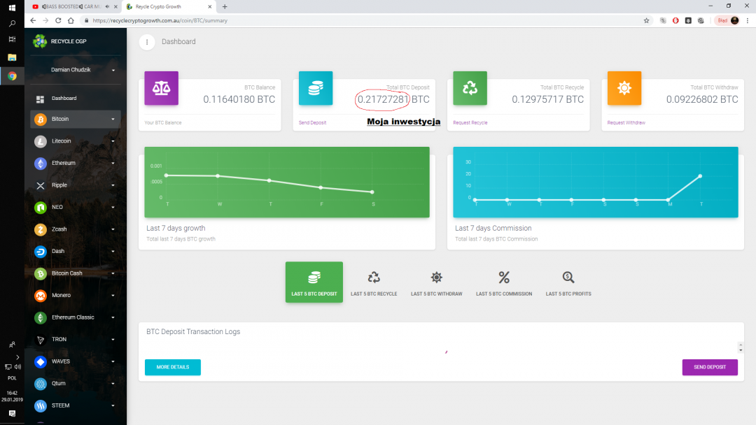WAŻNE - CZYTAJCIE MOJE OSTATNIE WPISY NA STRONIE ! Witajcie drodzy użytkownicy. Tego jeszcze nie było! Jedyny projekt, pomnażający kryptowaluty uciekł od aplikacji Telegram! Jak obiecali tak zrobili. Mowa tutaj o Recycle Bota a raczej Recycle Crypto Growth. Starzy użytkownicy apk telegramowej mają czas do wypłacenia wszystkich środków do okolic kwietnia! Oficjalnie uruchomianie nastąpiło w dniu dzisiejszym o godz 15:00 - 31.12.2018r Naliczenia co 6h - 0.475% w 24h - 1.9% przez 90 dni. Aktualizacja z dnia 29.01.2019: Minimalny Depozyt & Wypłaty ▪️0.009 BTC ▪️0.6 LTC ▪️0.6 ETH ▪️0.06 BCH ▪️0.3 DASH ▪️0.6 XMR ▪️0.6 ZEC ▪️150 XRP ▪️3 NEO ▪️3 ETC ▪️5000 TRX ▪️260 STEEM ▪️40 WAVES ▪️50 QTUM ▪️14500 ETN ▪️135 TPAY ▪️135 PIVX ▪️1000 XLM ▪️1000 POWR ▪️50000 DOGE ▪️3300 ADA Minimum do reinwestycji: ▪️0.003BTC, 0.2LTC, 0.03ETH ▪️1ETC, 0.02BCH, 0.1DASH ▪️0.2XMR, 0.2ZEC , 50XRP ▪️1NEO, 2500 TRX, 130 STEEM ▪️20 WAVES, 25 QTUM ▪️7250 ETN ▪️68 TPAY ▪️68 PIVX ▪️500 POWR ▪️500 XLM ▪️25000 DOGE ▪️1650 ADA Referral Bonus 3 poziomy: Poziom 1 - 10.0% Poziom 2 - 3.0% Poziom 3 - 1.0% Reinwestycji referral bonus Poziom 1 - 1.5% Poziom 2 - 1.0% Poziom 3 - 0.5% Firma jest wspierana przez ugruntowaną, wielomilionową firmę Ugandan, Pellegrino Oil & Gas LTD. Pellegrino Oil & Gas LTD jest uznanym, odnoszącym sukcesy i rentownym biznesem, który obecnie czerpie dochód, aby wywiązać się ze swoich zobowiązań wobec swoich członków poprzez inwestycje korporacyjne i liczne źródła przychodów: Oczyszczanie wody i recykling Recykling materiałów innych niż niebezpieczne Obróbka materiałów niebezpiecznych i bezpieczna utylizacja Testowanie i przetwarzanie wód podziemnych i dróg wodnych Obróbka, transport i usuwanie odpadów wiertniczych Strona www: https://recyclebot.com.au/ Dołącz do mnie, a otrzymasz pełne wsparcie z mojej strony, oraz wstęp do tajnej grupy, nie jestem jak inni pseudo liderzy!. Ważne! Proszę o kontakt ze mną na moim FB jeżeli dołączyłeś/as po moim reflinku lub jak masz problem z rejestracja na stronie web. https://www.facebook.com/damian.chudzik.1 Instrukcja: 1) Załóż konto na stronie: - CZYSTY: https://recyclecryptogrowth.com.au/auth/register - REF: https://recyclecryptogrowth.com.au/auth/register?referedby=136 2) W polu referral ID wpisz "0" - jeżeli byłeś użytkownikiem starej platformy RB na telegramie wpisz swój referal ID. 3) Kliknij w daną kryptowalute np Bitcoin --> Add deposit --> Skopiuj adres 4) Wejdź w swój portfel na giełdzie, wklej swój adres depozytu. Do 30min będziesz miał zaksięgowane środki w programie. 5) Po dokonaniu wpłaty musisz zweryfikować konto: http://www.recyclebot.com.au/verify Jak nie masz konta na giełdzie z kryptowalutami możesz założyć konto np na BitBay. WYPŁATY: można zlecać w piątki od godz 15:00 do soboty godz 15:00. Pamiętajmy o ryzyku inwestycyjnym, inwestuj tyle ile możesz stracić!