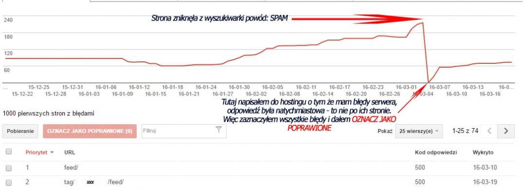 Witam z bólem serca i ściskiem pośladków muszę napisać ten post. Otóż kilka dni temu dopadło mnie jakieś paskudztwo na stronie. Paskudztwo jak paskudztwo, ale nikt nie może zdefiniować co to za rodzaj kary. Informacje z panelu GWT: brak jakiegokolwiek info w GWT natychmiastowy spadek pozycji w serplab w zasadzie to wszystko posiada status NOT FOUND linki po wklejeniu do wyszukiwarki pokazuje czyli Ostanio podjęte działania na stronie: zmiana szablonu naprawa zablokowanego pliku robot.txt ponieważ jakaś wtyczka z wordpresa zablokowała go pewnego dnia tak sama z siebie. Cechy techniczne strony ukaranej: każdy post był pisany ręcznie każdy post miał inna strukturę typu obrazek w treści jakiś filmik grafiki i inne dodatki. brak linków śmieciowych wszystko linkowane ręcznie Grafika: Spoczywaj stronko w pokoju,włożyłem w Ciebie dużo pracy ale nie zbadane są wyroki Google. -=-=-=-=-=-=- Zamieniam się w słuch i słucham Państwa co to za cholerstwo. Oczywiście domyślam sie też ze nic z tego nie będzie bo już minął prawie tydzień. Dlatego od jutra nowa domena i zaczynamy od zera ten sam peleton.