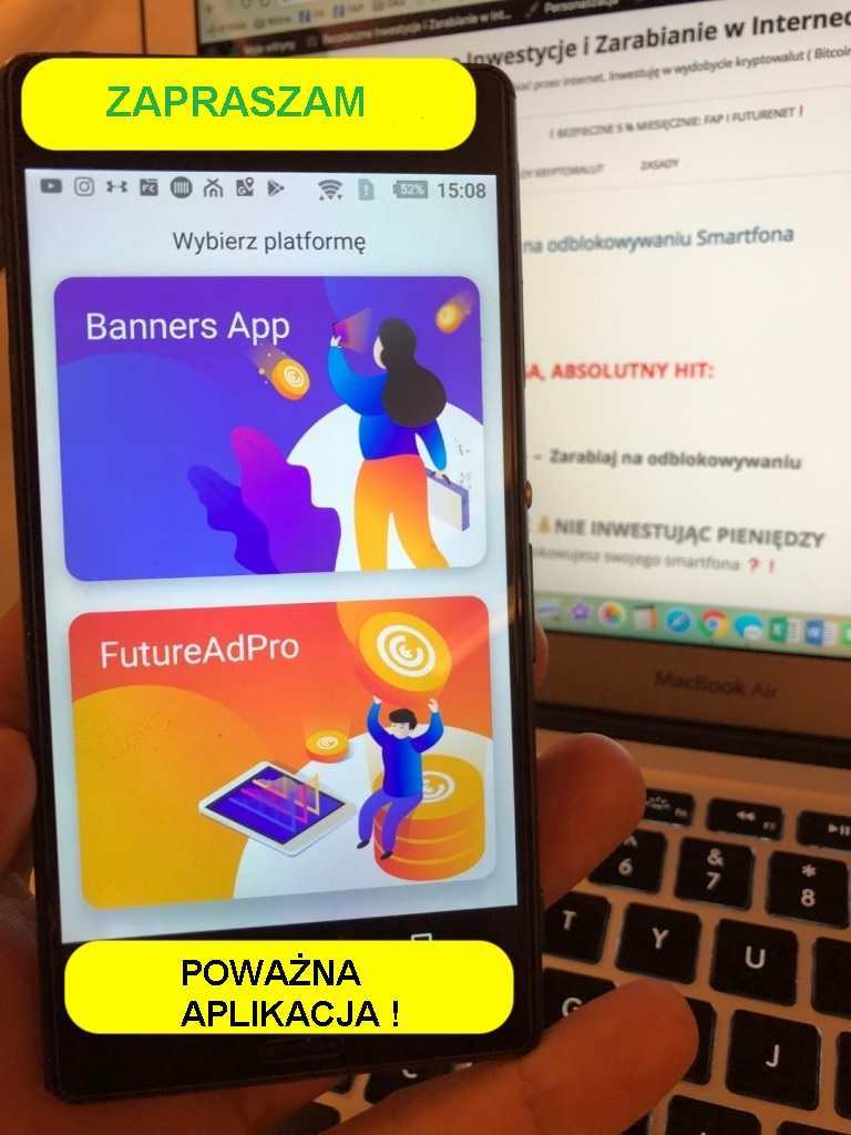 Witam appka FutureNet- BannersApp Ref : https://bannersapp.com/referral?code=czarek182 Czysty Link : https://bannersapp.com/Ogólnie polega to na tym, że apka przy odblokowaniu telefonu pokazuje ci reklamę. Nie musisz jej oglądać możesz od razu pominąć. Samemu wyciągniesz 25$ na miesiąc, a polecając masz nawet 8% od osób którym polecisz, a ogólnie zarabiasz do 5 poziomów w dół. Warto wejść bo apka dzisiaj wyszła i płaci w FUTUROCOIN Pod imieniem i nazwiskiem proszę wpisać czarek182