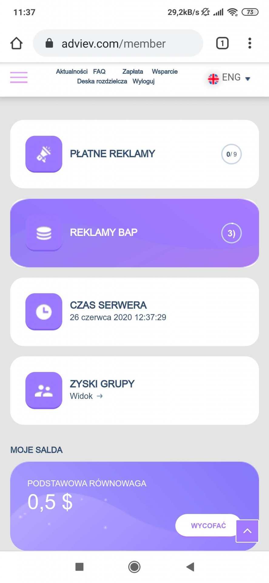 Witajcie ponownie. Temat dotyczy strony podobnej w działaniu do PTC share, czy futureadpro. Start jest za 4 dni od momentu wstawienia posta. W dniu wystawienia jest niespełna 2000 członków. Przy rejestracji przed startem otrzymujemy 2600 BAP i 0.5$ na start! Im więcej punktów BAP masz na koncie, tym droższe reklamy otrzymasz. Kupując BAP, każdy wydany 1 $ natychmiast daje 2440 BAP, co stanowi 1,22 $ w płatnych reklamach. Dodatkowo można kupować akcje. Zarabiamy do 0,9% dziennie z każdego zakupionego udziału. Po starcie programu napiszę coś więcej. Obecnie widzę dziennie trzeba będzie oglądać 9 reklam. Projekt ma dwa salda: saldo główne i saldo Reinvest. Zyski z akcji i wyświetlanie płatnych reklam będą dystrybuowane w następujący sposób:65% zysku zostanie dodane do salda głównego.35% zysków zostanie dodane do salda reinwestycji. Strona zrobiona jest bardzo dobrze. Przed startem niektóre funkcje są wyłączone. Brak błędów. Systemy płatności to PM Payeer BTC LTC Opłata wpłaty wynosi 1.75% Minimalna kwota wypłaty: 8 USD Minimalna kwota wypłaty BTC: 50 USD Dostępny limit wypłat na dzien: 30 USD Na teraz to wszystko. Zapraszam do zapoznania się ze stroną i kontakt w razie pytań. Czysty: https://adviev.com Ref: https://adviev.com/ref/1977/eng