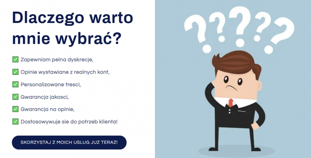 Witam, szukamy osób posiadających dodatkowe kanały sprzedaży dla naszych usług Prowadzę wraz z znajomym sprzedaż polskich opinii i przede wszystkim realnych usług na GOOGLE / FACEBOOK / TRIPADVISOR (reszta do dogadania) i szukamy dodatkowych kanałów sprzedaży, które pozwolą nam się rozwinąć i co najważniejsze zarobić. Mimo naszego młodego wieku podchodzimy do tematu profesjonalnie, na każde zlecenia są wykonywane raporty z najważniejszymi informacjami tj.: nazwa konta z, którego jest wystawiona opinia, treść opinii, link do wizytówki na, której opinia została wystawiona, data wystawienia, widoczność publiczna. Wszystkie opinie są widoczne publicznie, jeżeli wystawiona opinia się nie pojawi wykonujemy wszelkie kroki, które sprawiają że opinia jest widoczna. Na ten moment mamy kilka współprac z wiodącymi agencjami w naszym kraju, jesteśmy tzw. "podwykonawcami" co świadczy o naszym dokładnym wykonywaniu zamówień. Ważną informacją jest też, że mamy poniżej 18 lat i działamy jako niezarejestrowana działalność. Wszystkie zainteresowane współpracą osoby proszę o kontakt w wiadomości prywatnej, wszelakie ceny za opinię oraz maksymalnie ilości podamy po kontakcie z nami.- 4 odpowiedzi