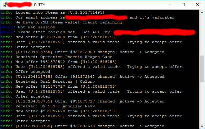 1. Nazwa przedmiotu: Nowy TRADEBOT z Auth Mobile Steam 2. Opis przedmiotu: Bot potwierdza i wysyła skiny do użytkownika (pobiera x% prowizji) Sprzedaję tylko pliki bota, za dodatkową opłatą mogę wgrać i skonfigurować bota. Bot nie działa na mongo ! 3. Źródło pozyskania: Bot został napisany pod inne strony typu: jackpot 4. Zdjęcia: W załączniku ! 5. Kontakt: GG:56183407 Email:dolardolarteam@gmail.com 6,7. Cena/Sposób zapłaty: PayPal / Przelew: 100zł CSGO: 25(€) w skinach PSC: 25(€) Mogę zainstalować i skonfigurować bota na stronie za dodatkową opłatą (PW) UWAGA ! W internecie krążą już nowe boty i są dostępne za darmo, ale nie dajcie się nabrać.Darmowe boty są tak napisane, żeby przy większych pulach, zmieniały TRADE URL i wysyłały skiny do swoich właścicieli.