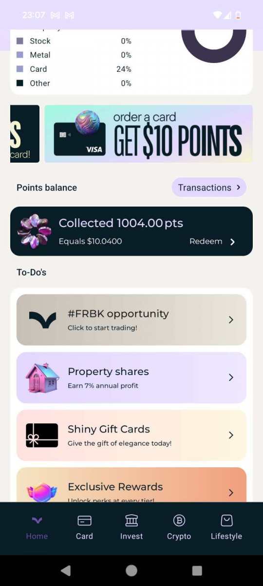 Pierwszy krypto bank jak to sami nazwali FREEBNK 10$ za weryfikację i zamówienie karty. Aby móc zamówić kartę trzeba zasilić konto kwota min 10$. Karta jest bezpłatna i środki pozostaja dla nas do wykorzystania Rejestracja: https://freebnk.app.link/?utm_ref=b395221b-d33b-4b51-b877-bd8253352009 Czysty link https://freebnk.io/ Nie wiem czy z czystego linku jest bonus ! Za każdego poleconego który zamówi kartę 10$ Bonusy dostajemy w punktach i można je zamienić na krypto