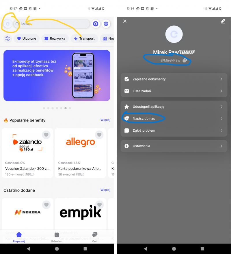Zarejestrowałem się i działa, więc polecam: 10 zł za rejestrację do wydania na dowolny voucher w efectivo app jak Żabka, Pyszne.pl, Carrefour itd..! Kroki: 1. Pobierz aplikację: https://pobierz.efectivo.app/U2mH/polec i zarejestruj się (tylko podstawowe dane) [to nie reflink, a link ogólny programu, ale podaję też czysty link apki: https://efectivo.app/] 2. Aby dostać 10 zł na start, poprzez opcję "Napisz do nas" lub fanpage apki wyślij do aplikacji kod w postaci mojego nicku: "MirekPaw" Jeśli chcesz 100 zł, jest teraz aktywny program poleceń: 3. Zaproś znajomych do pobrania aplikacji https://pobierz.efectivo.app/U2mH/polec (link jest jeden) 4. Znajomy rejestrując się niech poda Twoją nazwę użytkownika (jak powyżej) 5. Znajomy otrzyma 10 zł na start, a Ty otrzymasz 10 zł za każdego znajomego, który zrealizuje dowolny zakup w aplikacji - zarobisz do limitu 100 zł (10 znajomych). [Ja już swoje polecenia prawie zrealizowałem, ale bonus dla nowych użytkowników dalej działa] Opcja "Napisz do nas" jak i Twoja nazwa użytkownika widoczne są po kliknięciu miejsca na zdjęcie profilowe w górnym lewym rogu. Akcja jest ograniczona ilościowo!