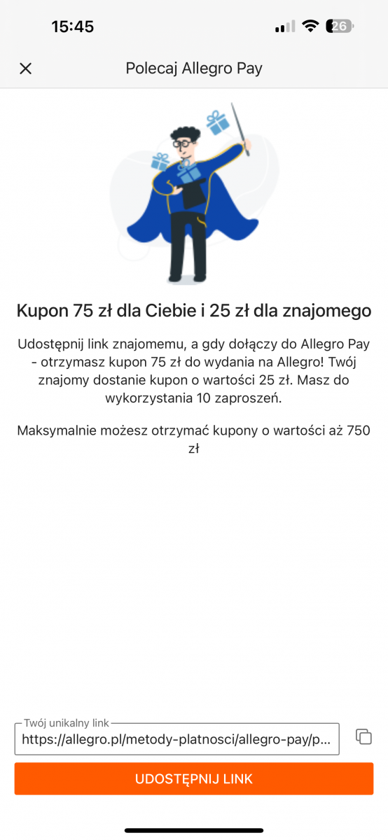 Allegro wprowadziło promocje za aktywację allegro pay dostaje się 25 zł na zakupy ilość miejsc ograniczona do 10 link do promocji https://allegro.pl/metody-platnosci/allegro-pay/polecam/v6/4e639596-3840-4722-ad97-94a9cc642115 czysty link https://allegro.pl/metody-platnosci/allegro-pay/ zapraszam 10 miejsc- 5 odpowiedzi
